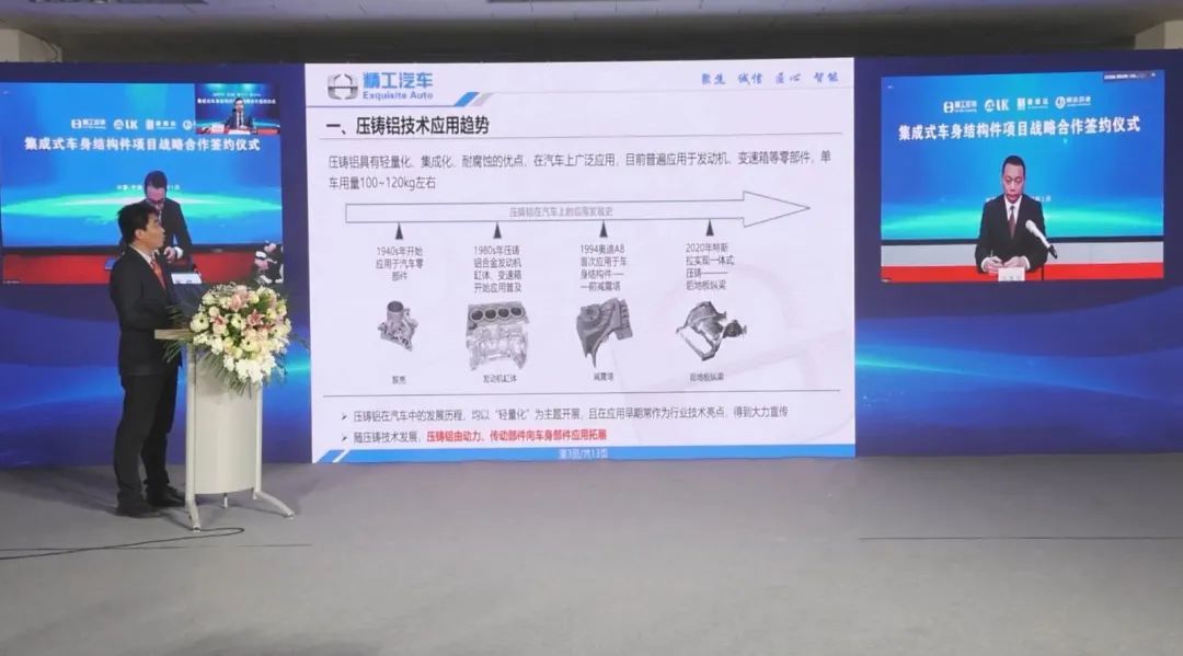 嘉賓們圍繞行業(yè)發(fā)展趨勢、鋁合金材料研發(fā)、車身輕量化制造進(jìn)行了探討、交流。專家一致認(rèn)同,當(dāng)前汽車行業(yè)正處于百年未有之大變局,新能源汽車輕量化制造、汽車結(jié)構(gòu)件一體化壓鑄成型正成為發(fā)展趨勢。 精工壓鑄總經(jīng)理陸德宇表示,精工壓鑄在結(jié)構(gòu)件生產(chǎn)關(guān)鍵技術(shù)如高真空工藝、模溫控制技術(shù)等方面具有多年實(shí)踐經(jīng)驗(yàn),目前已具備生產(chǎn)大型車身結(jié)構(gòu)件的技術(shù)基礎(chǔ)。接下來,將加快實(shí)施轉(zhuǎn)型,建設(shè)結(jié)構(gòu)件生產(chǎn)基地,打造行業(yè)標(biāo)桿! 集成式車身結(jié)構(gòu)件項(xiàng)目簽約儀式 論壇結(jié)束后,進(jìn)入“集成式車身結(jié)構(gòu)件項(xiàng)目簽約儀式”環(huán)節(jié),精工壓鑄項(xiàng)目總監(jiān)李華先生首先介紹了集成式車身結(jié)構(gòu)件項(xiàng)目進(jìn)展。應(yīng)用研究表明,一體壓鑄技術(shù)在減重、簡化生產(chǎn)工藝、減少人工等方面具備優(yōu)勢,具有廣闊的應(yīng)用前景,應(yīng)用一體壓鑄后產(chǎn)品減重效率達(dá)24.6%;相較鋼鋁混合形式,消除了異種連接,簡化了下車身制造工藝,提升了自動(dòng)化率及生產(chǎn)效率;直接人工降幅達(dá)62%。