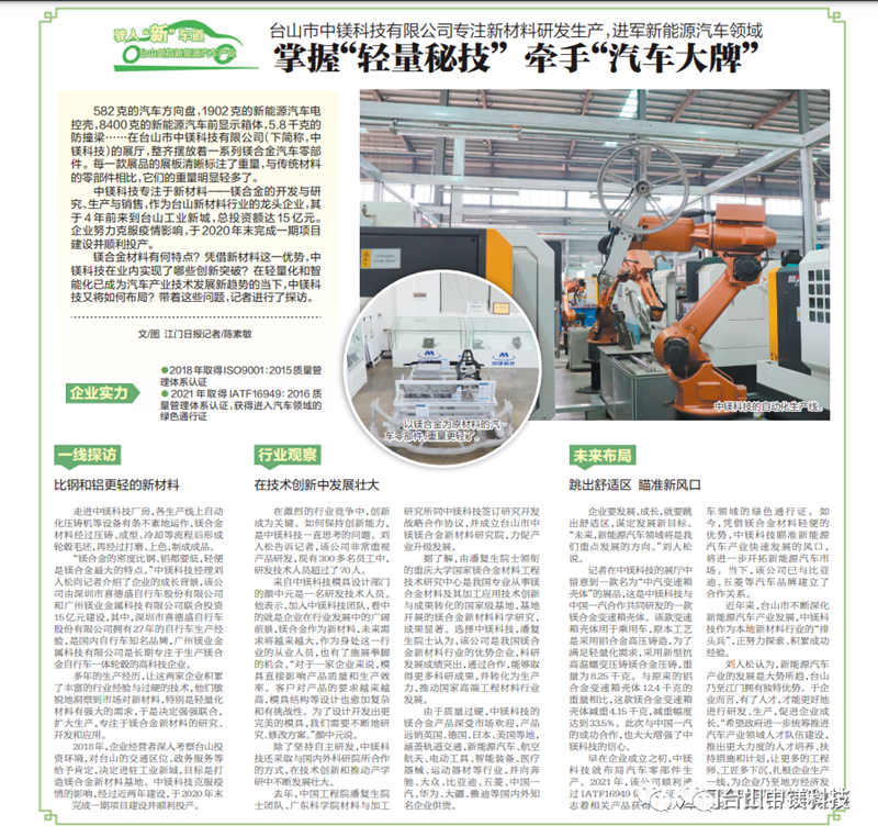 原標題:掌握“輕量秘技”,臺山中鎂科技牽手“大牌”進軍新能源汽車領域 在臺山市中鎂科技有限公司(下簡稱,中鎂科技)的展廳,整齊擺放著一系列鎂合金汽車零部件。每一款展品的展板清晰標注了重量,與傳統材料的零部件相比,它們的重量明顯輕多了。 中鎂科技專注于新材料——鎂合金的開發與研究、生產與銷售,作為臺山新材料行業的龍頭企業,其于4年前來到臺山工業新城,總投資額達15億元。企業努力克服疫情影響,于2020年末完成一期項目建設并順利投產。