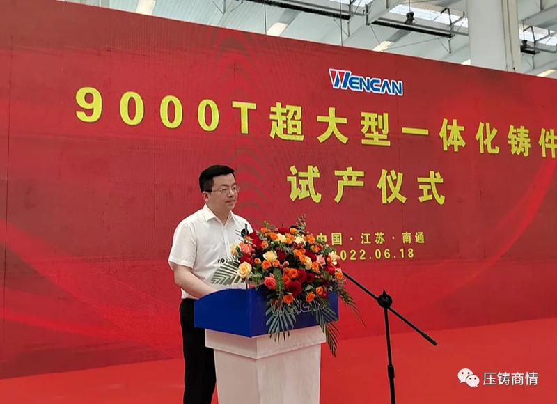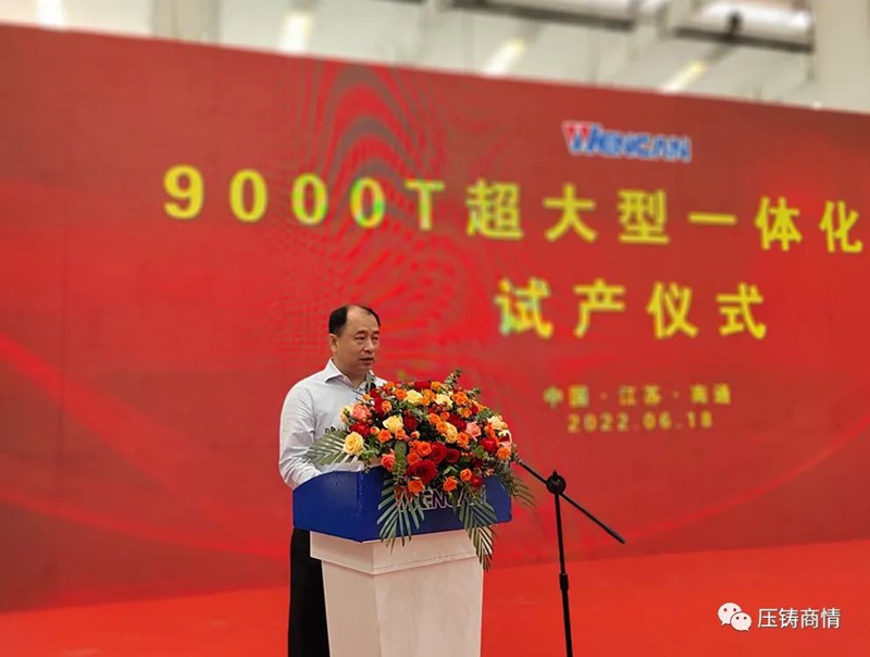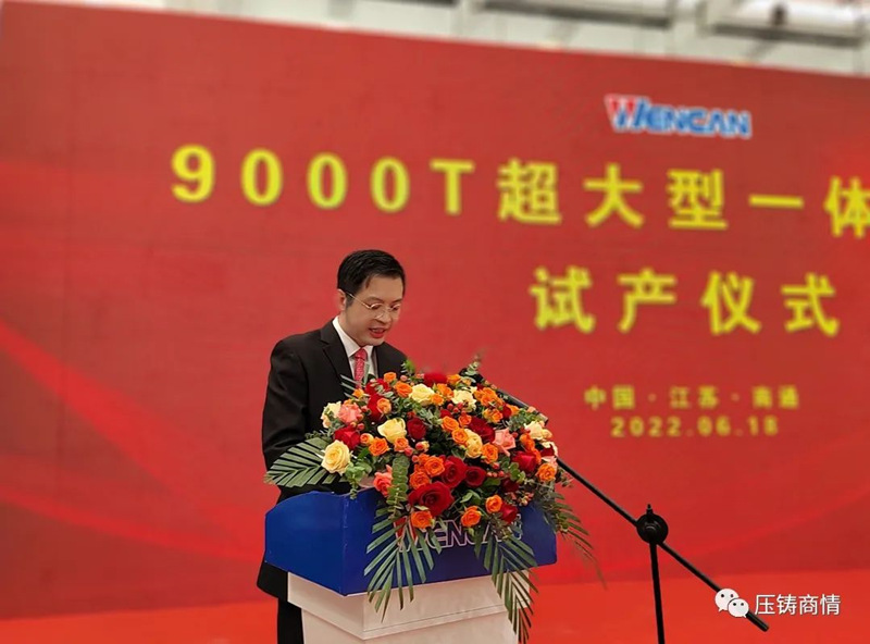 文燦集團董事長兼總經理唐杰雄先生致辭 唐杰雄先生在致辭中感謝各位來賓克服疫情的干擾,來到文燦集團南通基地,參加江蘇雄邦 9000T 超大型一體化鑄件試產儀式。他表示,此次南通基地試產的后地板項目,是從 6000 噸跨躍到 9000 噸,是整體式后地板的超大型一體化壓鑄的重要里程碑,也是文燦集團率先采用 9000T 試制后地板項目的突破性舉措,更好地保證了產品的質量。為客戶解決繁瑣的裝配過程,實現(xiàn)更高精度更高性能的大型一體化壓鑄開啟了壓鑄界的新篇章。 據介紹,文燦南通生產基地目前已量產的壓鑄機共有 48 臺,其中大噸位壓鑄機已有 20 臺,6000 噸 2 臺,9000 噸 1 臺。到今年年底會再布局安裝 2800、3500、 4500 及 7000T 的 8 臺大型壓鑄機,以滿足日益新增的訂單需求。南通生產基地從 2012 年投入車身結構件的研發(fā),一路走來歷經設備選型定位、工藝突破、材料壁壘突破、模具創(chuàng)新等,挑戰(zhàn)了很多的不可能;2021 年,又進一步探索超大型一體化鑄件的研發(fā),先發(fā)布局、再次挑戰(zhàn)與攀頂壓鑄極限。