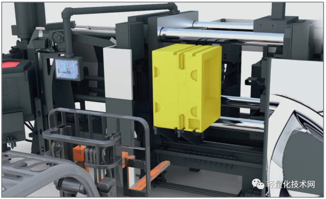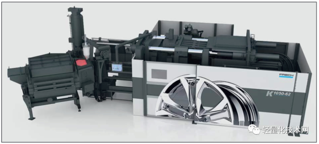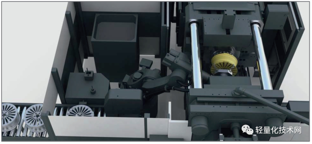 圖6. TURBU-PRESSURE-CASTING技術(shù)概覽 采用TURBU-PRESSURE-CASTING(無湍流壓力鑄造)專利工藝生產(chǎn)的輕合金車輪在鑄造完成后,就已經(jīng)具備了車輪所需的強(qiáng)度性能,因此不需要額外的能量密集型制造工藝了,如切削、流動(dòng)成型或熱處理(T6)等。 為了符合二氧化碳排放的限制要求,汽車鋁合金鑄造車輪越來越多地使用價(jià)格昂貴的附加塑料罩蓋。采用TURBU-PRESSURE-CASTING(無湍流壓力鑄造)技術(shù)工藝,可以通過鑄造工藝生產(chǎn)出符合空氣動(dòng)力學(xué)要求的車輪光潔表面,從而省去塑料車輪罩蓋。此外,采用該工藝方法也可以實(shí)現(xiàn)螺栓孔或剛度結(jié)構(gòu),這可以通過標(biāo)準(zhǔn)方法來完成,例如僅通過少許的機(jī)械加工完成,或者根本不需要通過機(jī)械加工。 4.壓鑄系統(tǒng)無障礙模具更換 TURBU-PRESSURE-CASTING(無湍流壓力鑄造)團(tuán)隊(duì)與合作伙伴一起開發(fā)了一種基于特殊冷室壓鑄機(jī)的鑄造單元,這使得可以在車輪鑄造后立即對鋁合金車輪進(jìn)行處理,這樣只有“好的部件”才能離開單元,在車輪中心進(jìn)行少許的精加工。因此,不會在生產(chǎn)鏈內(nèi)造成價(jià)值損失,如圖7所示。