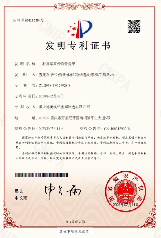 重慶博奧鎂鋁金屬制造有限公司(以下簡稱:重慶博奧)申請的發(fā)明專利“一種客車座椅骨架”(專利號:ZL 201810129148.3),“一種客車座椅靠背骨架頭部集成結(jié)構(gòu)”(專利號:ZL 201810129164.2),“一種客車座椅靠背骨架”(專利號:ZL 201810129928.8),獲得國家知識產(chǎn)權(quán)局授權(quán)。 此次獲得授權(quán)的發(fā)明專利圍繞鎂合金在商用大客車等大型車座椅骨架的應(yīng)用場景,以輕量化為目標(biāo),提出了一種集成化一體化的鎂合金大巴車座椅骨架、座椅頭部集成結(jié)構(gòu)、鎂合金座椅靠背結(jié)構(gòu)。大客車座椅骨架應(yīng)用鎂合金材料,每組座椅可實現(xiàn)大約7.5Kg左右的減重,減重比43%左右,如果單車按37座的計算,每臺車可實現(xiàn)減重約138Kg。對整車減重有明顯貢獻(xiàn),可以有效提高車輛續(xù)航能力和節(jié)能減排。
