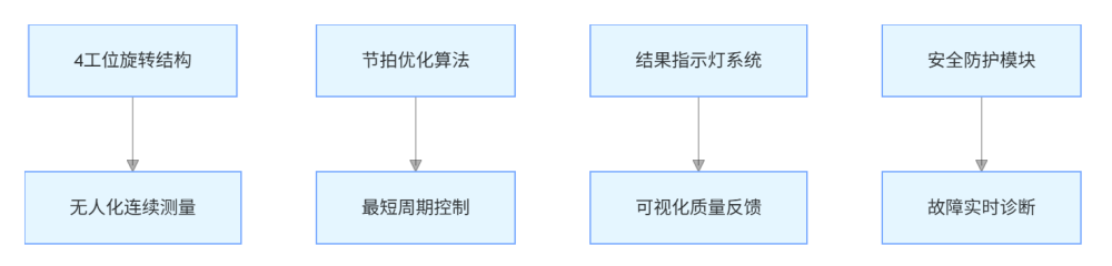 四大核心優(yōu)勢(shì):重新定義自動(dòng)化檢測(cè)標(biāo)準(zhǔn) 4工位旋轉(zhuǎn)上下料:全流程無(wú)人化的“神經(jīng)中樞” 集成先進(jìn)的4工位旋轉(zhuǎn)機(jī)構(gòu),搭配機(jī)械手/AGV智能對(duì)接產(chǎn)線,實(shí)現(xiàn)工件自動(dòng)裝卸、測(cè)量、分揀的全閉環(huán)流程; 無(wú)需人工介入,避免人為誤差,生產(chǎn)線可連續(xù)運(yùn)行,產(chǎn)能釋放效果顯著,設(shè)備利用率提升至90%以上。 精密節(jié)拍優(yōu)化:用算法壓縮時(shí)間的“效率引擎” 內(nèi)置智能節(jié)拍圖譜,對(duì)托盤(pán)旋轉(zhuǎn)、測(cè)量執(zhí)行、結(jié)果輸出等全流程進(jìn)行優(yōu)化; 最短測(cè)量周期控制技術(shù),讓單個(gè)工件檢測(cè)時(shí)間壓縮至傳統(tǒng)模式的1/4,產(chǎn)能提升立竿見(jiàn)影。 人機(jī)工程革新:把工人從“重復(fù)勞動(dòng)”中解放 顛覆傳統(tǒng)人工站立作業(yè)模式,操作人員僅需完成初始裝夾與結(jié)果分揀; 勞動(dòng)強(qiáng)度降低70%,同時(shí)避免疲勞導(dǎo)致的測(cè)量偏差,精度一致性顯著提升。 安全矩陣設(shè)計(jì):24小時(shí)作業(yè)的“防護(hù)盾” 集成電氣故障診斷、過(guò)載保護(hù)、急停按鈕等多重安全模塊; 結(jié)果指示燈實(shí)時(shí)反饋測(cè)量狀態(tài),配合安全防護(hù)欄,實(shí)現(xiàn)生產(chǎn)零事故運(yùn)行。