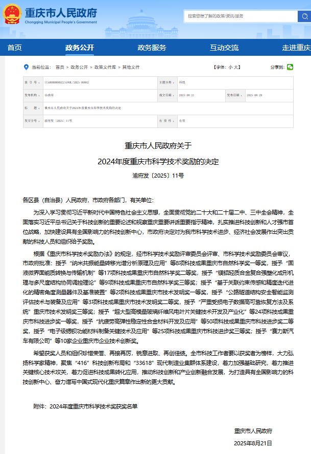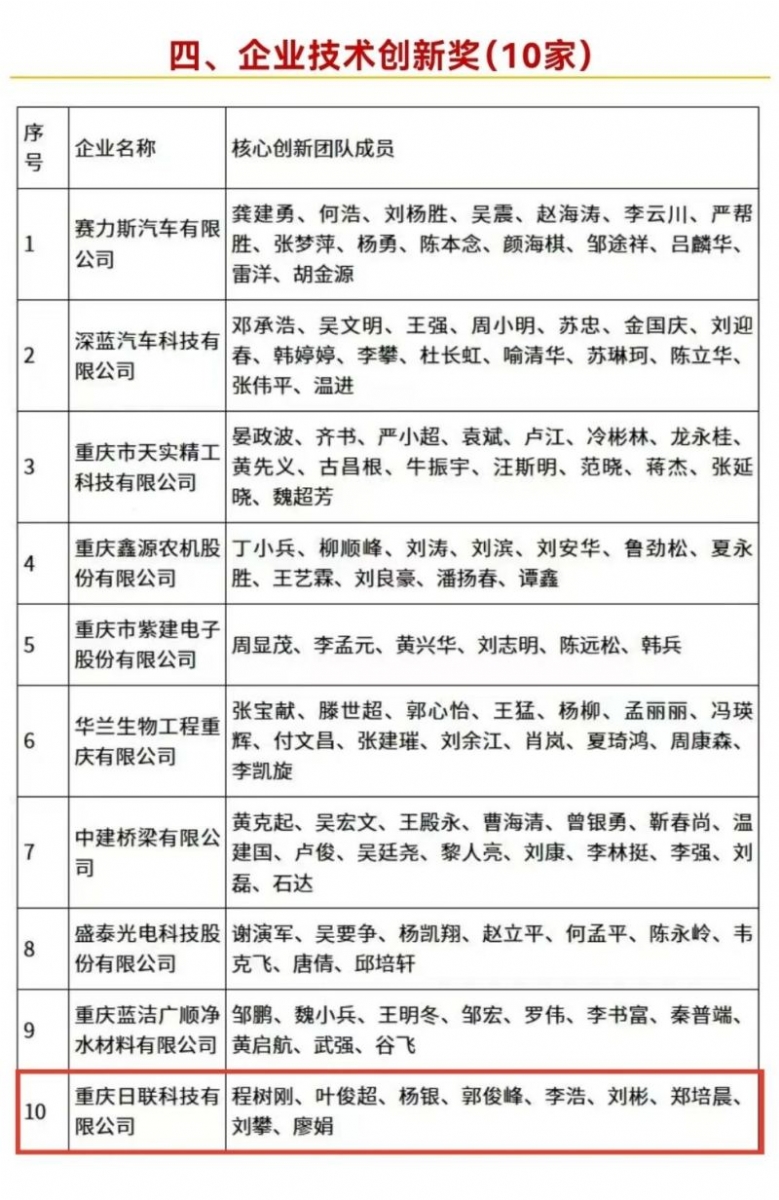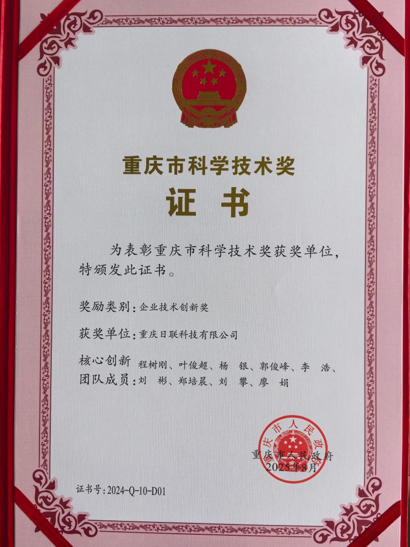 8月28日,重慶市科技創(chuàng)新大會召開,會議宣讀了2024年度重慶市科學技術獎勵的決定。重慶日聯(lián)科技有限公司獲評“企業(yè)技術創(chuàng)新獎”。 2024年重慶市科學技術獎獲獎名單(同等級獎項排名不分先后)