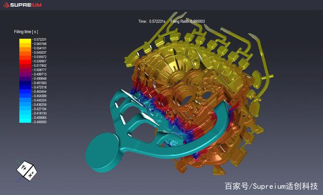 圖4、鑄造生產(chǎn)線部署的高速CT系統(tǒng) 工藝反饋及調(diào)整 在鑄件被CT檢測(cè)并獲得三維實(shí)體數(shù)據(jù)的前提下,我們假設(shè)有這樣一種算法:能夠以非常高效的方式將該數(shù)據(jù)進(jìn)行整體分析,并給出鑄件內(nèi)部缺陷的所有信息,包括類型、尺寸和分布等,那么我們就能利用這個(gè)信息對(duì)生產(chǎn)工藝本身進(jìn)行調(diào)整和修正,并最終獲得無(wú)超標(biāo)缺陷的合格鑄件。這個(gè)過(guò)程——即獲得鑄件信息并修正工藝的過(guò)程,我們稱之為工藝反饋和調(diào)整過(guò)程。當(dāng)然,我們不能只根據(jù)一個(gè)鑄件的信息來(lái)完成這個(gè)過(guò)程,最正常的情況應(yīng)該是獲得大量鑄件的信息,通過(guò)統(tǒng)計(jì)分析和工藝關(guān)聯(lián)的方法解決鑄件的缺陷問(wèn)題。 接下來(lái)的問(wèn)題是,即使我們獲得了大量鑄件內(nèi)部的缺陷分布信息,我們又如何通過(guò)調(diào)整工藝參數(shù)來(lái)規(guī)避不合格缺陷呢?現(xiàn)有的最有力的分析工具是計(jì)算機(jī)數(shù)值模擬,也就我們熟知的計(jì)算機(jī)輔助工程(CAE)技術(shù)。 采用計(jì)算機(jī)模擬技術(shù),我們可以實(shí)現(xiàn)局部意義上的虛擬生產(chǎn),特別地針對(duì)壓鑄,我們可以將充型和凝固過(guò)程直接進(jìn)行數(shù)值模擬,通過(guò)研究流體充填型腔過(guò)程的速度、壓力、流態(tài)、噴濺等行為,來(lái)判斷充填過(guò)程是否存在卷氣;通過(guò)計(jì)算壓鑄不同循環(huán)條件下鑄件和模具的溫度的變化,來(lái)判斷和研究模具潛在的熱節(jié)、鑄件缺陷(縮孔、縮松)以及壓鑄熱平衡行為。通過(guò)這種數(shù)值模擬技術(shù),在一定的分析條件的基礎(chǔ)上,我們?cè)诤艽蟪潭壬峡梢耘袛嗖⒁?guī)避鑄件內(nèi)部的缺陷,提高鑄件性能并大幅提高生產(chǎn)效率,達(dá)到之前我們討論的工藝反饋和修正的目的。