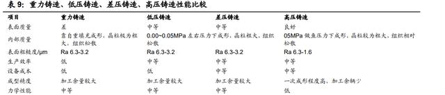 高壓鑄造:高壓鑄造模具可以反復利用,通過模具內的冷卻系統可以實現快速 成型并連續生產,且可以保證更好的強度以及精度。主要應用于發動機缸體、 變速箱殼體、油槽、發動機支座和跨車梁等結構件。 真空壓力鑄造:許多結構件裝在車身結構的節點上并與其他構件連接形成抗變 形的高強度框架,這類結構件通常具有尺寸大、壁薄、結構復雜等特征。所以 對汽車結構件的力學性能要求高.常規壓鑄工藝生產的鑄件無法滿足此類要求, 需要采用高真空壓鑄工藝。目前國際上大多數豪車對該技術均有不同程度的應 用,如:奧迪 Q7、 奧迪 A8、謳歌 NSX、阿斯頓·馬丁 DB11、凱迪拉克 CT6、 奔馳 AMG GT 等。菲亞特、保時捷卡宴、寶馬 4/5/6 系車型上都安裝有高真空 壓鑄鋁合金副車架。 低壓鑄造:除車輪和缸蓋外,該工藝主要用于汽車懸架系統、轉向系統、行駛 系統的輕量化構件生產,迄今已在國外高端汽車的上述系統的鋁合金構件生產 上得到批量應用,達到了極好的輕量化和提高車輛駕乘性能的效果。在國內, 除車輪、缸蓋外,底盤和懸架系統其他方面的應用較少。 擠壓鑄造:隨著新能源汽車的發展和汽車輕量化的需要,先進的擠壓鑄造技術 在汽車結構件上的應用將越來越廣泛,如控制臂類、擺臂類、連桿類、發動機 支架、輪邊支架類等底盤件已部分應用鋁合金材料制造。可取代部分鍛造生產高性能復雜結構件。 從各類壓鑄工藝參數比較來看,高壓壓鑄生產效率高、強度、精度高的特點的 優勢,是鋁鎂汽車鑄件的理想選擇。根據 LP information 的研究,高壓壓鑄全球 市場規模將從 2019 年的 1.19 億美元增長至 151.8 億美元。
