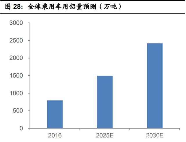 鋁合金壓鑄件向大型化、一體化發展。汽車用鋁在汽車行業主要以壓鑄、擠壓 和壓延三種形態投入使用,其中壓鑄件用量占比約 80%。目前,國內外汽車用 鋁合金壓鑄件應用范圍已用于結構件、受力件、安全件和裝飾件等,主要包括: 熱交換器、空氣壓縮機活塞、引擎副框架、懸掛部件、剎車部件、駕車軸、車 身結構部件、輪轂、尾部面板、儀表盤、玻璃邊框、配電系統、發動機蓋、保 險杠。未來,隨著鋁合金材料應用技術的進一步提升,其在汽車領域的應用范 圍將逐漸延伸至引擎蓋、擋泥板、車門、后車廂、車頂、整車身等現以鋼鑄件 為主的大型部位。 3、鋁壓鑄行業空間廣闊,產業鏈迎來國產化機遇 上游鋁材:預計 2030 年全球乘用車車輛用鋁市場規模達 3630 億元 2016 年乘用車單車用鋁約為 110kg,預計到 2025 年將達到 187kg,到 2023 年將 達到 242kg。據此計算,2016 年中國乘用車車用鋁為 269 萬噸,到 2025 年將達 到 468 萬噸,2030 年達到 726 萬噸。 2016 年乘用車單車用鋁約為 110kg,國際鋁業協會預計到 2025 年將達到 187kg, 到 2030 年將達到 242kg,CAGR 為 5.8%。2016 年全球乘用車產量為 7239 萬輛, 假設到 2025 年全球乘用車產量為 8000 萬輛,2030 年全球乘用車產量為 1 億輛。 據此計算,2016 年全球乘用車用鋁為 796 萬噸,到 2025 年將達到 1496 萬噸, 2030 年達到 2420 萬噸。2016 年中國乘用車車用鋁為 269 萬噸,到 2025 年將達 到 468 萬噸,2030 年達到 726 萬噸。