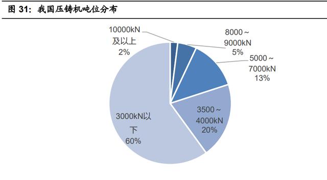 假設 2030 年全球鋁錠價格為 15000 元每噸,按照 2420 萬噸的汽車用鋁量計算, 2030年全球乘用車車身用鋁規模為3630億元,我國汽車用鋁規模約為1089億元。 汽車鋁材標的有立中集團、亞太科技、明泰鋁業、永茂泰、南山鋁業等汽車鋁材供 應商。 競爭格局方面,我國鋁擠壓企業眾多,超過 900 家,大部分企業生產能力較為 薄弱,比如生產能力低于 5 萬噸/年的企業數量超過 800 家。 大型壓鑄機:預計 2030 年全球市場容量約為 2240 億 當前壓鑄機以小型機為主。壓鑄機是壓鑄生產的主體設備,鎖模力≤4000KN 為小 型機、4000-8000KN 為中型機、10000KN 以上為大型機。根據《中國壓鑄行業發 展歷程及現狀》中的數據,我國壓鑄機設備中(2011 年),10000KN 以上壓鑄機 僅占 2%、8000-9000KN 的壓鑄機占 5%,5000-7000KN 壓鑄機占 13%,4000kt 以下壓鑄機占 80%。 為適應壓鑄件生產的要求,我國的壓鑄機發展更為迅速,某些指標已經達到或接近 國際水平,正在向大型化、自動化和單元化進軍。以力勁公司為代表,開發了鎖模 力 30000kN 的大型壓鑄機(2004 年 7 月)、鎖模力 40000kN 的臥式冷室大型 壓鑄機(2010 年);蘇州三基、廣東伊之密、無錫新佳盛、灌南壓鑄機等壓鑄企 業也生產了 26000kN 以上的大型壓鑄機。