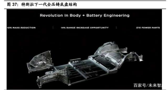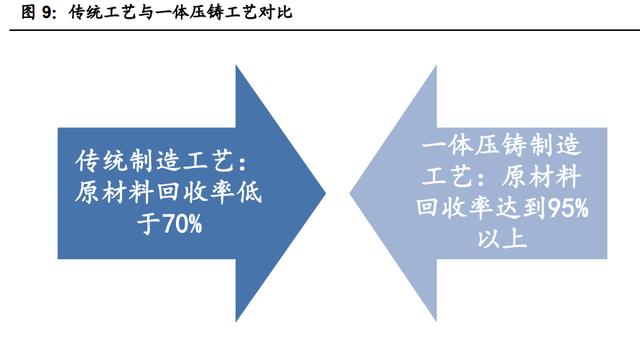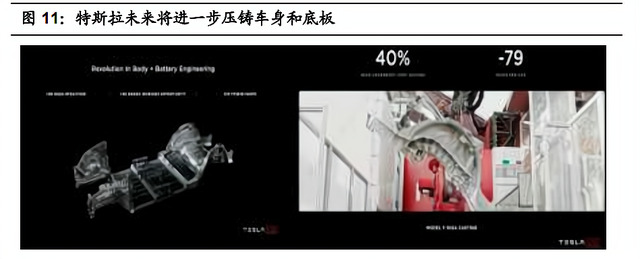 特斯拉將繼續引領車身壓鑄一體化隨著一體壓鑄技術的進一步完善成熟,特斯 拉的生產效率會持續提升。根據特斯拉早前申請的壓鑄機專利顯示,未來特斯 拉的車身將由 5 塊壓鑄大件組成、底盤將由 3 塊壓鑄件組成,一輛車僅 8 塊構 件,預期將降低 40%的生產成本,生產效率必將持續提升。 一體壓鑄應用范圍有望延伸,新能源應用趨勢強 按照白車身 3000 個焊接當量計算,白車身連接裝配工藝成本相對于鋼制車身的增 量為 1200-1800 元/臺,而傳統鋼制車身的焊裝成本不超過 1000 元/臺,鋁制白 車身的焊裝成本是鋼制白車身的 3 倍,原材料成本是鋼車身的 4-5 倍,成本是制約 鋁合金應用的重要原因。一體壓鑄在降低原材料用量的同時,節省了焊裝成本。 前中后底板有望 3-5 年內實現一體化壓鑄。市場上目前采用一體化壓鑄工藝的主要 是后底板,特斯拉已生產出一體化壓鑄的前底板。據業內專家估計,未來中底板也 能有望能實現一體式壓鑄,大概還需要 2-3 年的時間,主要取決于 CTC 技術的實 現。中底板需要的壓鑄噸位比前后底板要更大一點,前后底板批量生產之后再考慮 中底板,有望在未來 3-5 年將前中后底板一次做起來。前中后底板是整個白車身最 核心的部分,A 柱、B 柱應用一體化壓鑄工預計時間會更長一點。整個白車身一體 化壓鑄關鍵在于前中后底板能不能連起來。 一體壓鑄將擴展至白車身、四門、后蓋等。當前汽車用鋁主要集中在驅動系統、變 速箱、傳動系統、制動系統等位置,隨著技術的進一步提升,應用范圍將逐漸延伸 至引擎蓋、擋泥板、車門、后車廂、車頂、整車身等現以鋼鑄件為主的大型部位, 滲透率進一步提高。汽車用鋁在汽車行業主要以壓鑄、擠壓和壓延三種形態投入使 用,其中壓鑄件用量占比約 80%。未來,一體壓鑄工藝將主要取代白車身、四門、 后蓋結構件的沖壓和焊接環節,適用范圍和占比均有望提高。