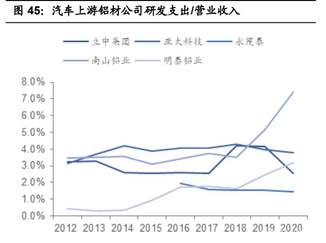 4、財務數據比較 上游鋁材 營收以及凈利潤規模方面,南山鋁業營收規模和利潤規模行業領先,收入超過 200 億元,利潤超過 20 億元;明泰鋁業和立中集團收入規模增長較快,收入規 模 150 億元左右;永茂泰以及亞太科技收入規模在 30-40 億元左右。 毛利率方面,南山鋁業、亞太科技毛利率基本保持在 20%左右的水平,永茂泰 毛利率保持在 15%左右的水平,立中集團和明泰鋁業毛利率 10%左右。凈利率 方面,南山鋁業、亞太科技為 10%左右,永茂泰、明泰鋁業提升較快。 ROE 方面,永茂泰、明泰鋁業、立中集團處于較高水平,亞太科技、南山鋁業 ROE 相對較低。ROA 方面,明泰鋁業、永茂泰 11%-12%左右,立中集團、亞 太科技 8%左右,南山鋁業 5%左右。 研發支出方面,南山鋁業研發支出行業領先,2020 年研發支出 16.5 億元,其 次為明泰鋁業(5.2 億元)、立中集團(3.4 億元)、亞太科技、永茂泰(1.5 億 元)。研發支出占收入比重方面,2020 年南山鋁業占比為 7.4%,其次為亞太科 技(3.8%)、明泰鋁業(3.2%)、立中集團(2.5%)、永茂泰(1.5%)。