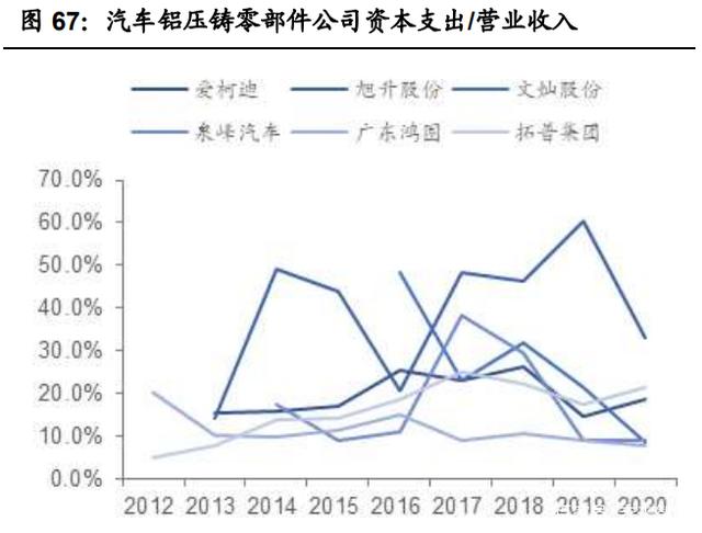下游零部件: 營收以及凈利潤規模方面,拓普集團鋁壓鑄以外業務占比較高營收規模較大。 廣東鴻圖收入規模行業領先,2020 年營收為 56 億元,愛柯迪、文燦股份 2020 年收入規模為 26 億元,旭升股份、泉峰汽車收入分別為 16、14 億元。凈利潤 方面,拓普集團、愛柯迪、旭升凈利潤水平較高。 毛利率方面,旭升股份、愛柯迪、泉峰汽車相對較高,2020 年毛利率分別為 32.9%、30.3%、26.1%;文燦股份、拓普集團、廣東鴻圖 2020 年毛利率分別 為 23.6%、22.7%、22.2%。凈利率方面,愛柯迪、旭升股份凈利率相對較高, 2020 年凈利率分別為 20.4%、16.9%;拓普集團、泉峰汽車、文燦股份、廣東 鴻圖 2020 年凈利率為 9.7%、8.7%、3.5%、3.5%。 ROE方面,旭升股份、愛柯迪、泉峰汽車相對較高,2020 年 ROE分別為 13.7%、 10.1%、8.0%;拓普集團、泉峰汽車、文燦股份、廣東鴻圖分別為 8.3%、8.0%、 3.5%、3.5%。 研發方面,行業整體研發支出擴張較快,拓普集團與廣東鴻圖研發支出絕對值 較高。研發支出占營收比重方面,泉峰汽車、拓普集團、愛柯迪、廣東鴻圖占 比較高。 資本支出方面,行業整體上升較快,拓普集團、旭升股份、愛柯迪資本開支水 平高,2020 年資本支出為 14.1、5.4、4.9 億元。資本支出占收入比重方面,旭 升股份、拓普集團 2020 年占比為 33.3%、21.6%,處于較高水平。(報告來源:未來智庫)