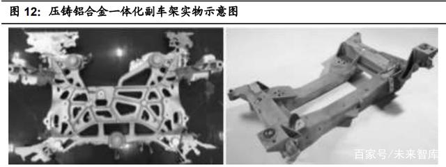 從白車身部位來看,防撞梁、發罩鋁合金的鋁合金應用門檻最低,其次是行李箱蓋、 翼子板及其它覆蓋件。包括 B 柱、縱梁、門檻、頂蓋縱梁等關鍵傳力結構件在內 的白車身本體對設備成本、節拍、連接工藝質量控制都有較高要求,應用鋁合金相 對較難。目前已知已經在開發或已經在應用鋁合金材料的有:電池托架、減震塔、 后 A 柱、D 柱、門框、座椅、后橋、后縱梁等。 車身用鋁行業增長空間巨大。根據國際鋁業協會的計算,純電動車用鋁最高可達 361.3kg,占整備質量的 33.1%。2018 年單車用鋁為 128.4kg,滲透率(實際用鋁 /理論用鋁最大值)為 31%,預計 2025 年單車用鋁達到 226.8kg,滲透率為 50%; 2030 年單車用鋁達到 283.6kg,滲透率為 56%。 汽車鋁壓鑄件向大型化、一體化發展 汽車壓鑄工藝主要分為鑄造、鍛造、沖壓三大類。 1)鑄造是將液體金屬澆鑄到與零件形狀相適應的鑄造空腔中,待其冷卻凝固后, 以獲得零件或毛坯的方法。分為壓力鑄造、擠壓鑄造等。采用鑄造工藝生產的 零件主要為殼體類和支撐類, 2)鍛造是一種利用鍛壓機械對金屬坯料施加壓力,使其產生塑性變形以獲得具 有一定機械性能、一定形狀和尺寸鍛件的加工方法。采用鍛造工藝生產的零件 主要為力學性能要求較高的零件,例如車輪、底盤懸架系統控制臂、轉向節、 空調壓縮機渦旋盤等。 3)沖壓是將原材料用合適的沖壓模具沖壓成型。是在常溫下用沖床等機器將半 成品做成成品的過程。汽車制造中 60%-70%的金屬零部件需要經過塑性加工, 沖壓是重要的手段,如各種覆蓋件、車內支撐件、架構加強件,以及發動機排 氣管及消聲器、空心凸輪軸、油底殼、發動機支架、框架結構件、橫縱梁等。 4)在汽車鋁合金壓鑄工藝中,壓力鑄造占比 80%左右,鋁合金擠壓件和鋁合 金沖壓件各占 10%左右。