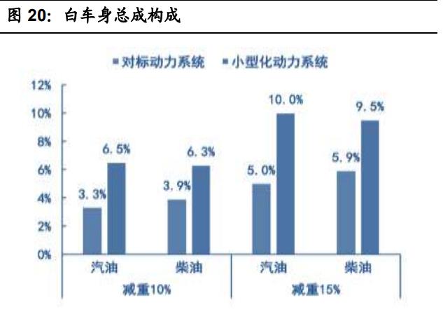 輕量化大勢所趨,單車用鋁量提高 工信部發布的平均油耗目標逐年降低,迫使汽車廠商進行輕量化改革。根據國 家工信部發布的平均油耗目標,2020 年的目標為 5 升/百公里,相比 2015 年的 6.9 升/百公里,降幅較大,要求越來越高。 輕量化作為汽車節能的關鍵技術之一,有顯著的節能效果。據實驗,汽油乘用 車減重 10%可以減少 3.3%的油耗,減重 15%可以減少 5%的油耗;柴油乘用 車則可以分別相應減少 3.9%和 5.9%的油耗;電動車(包括插電式混合動力車) 也可以分別相應減少 6.3%和 9.5%的電能消耗。