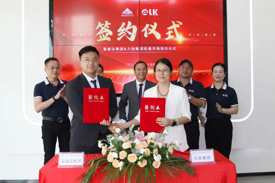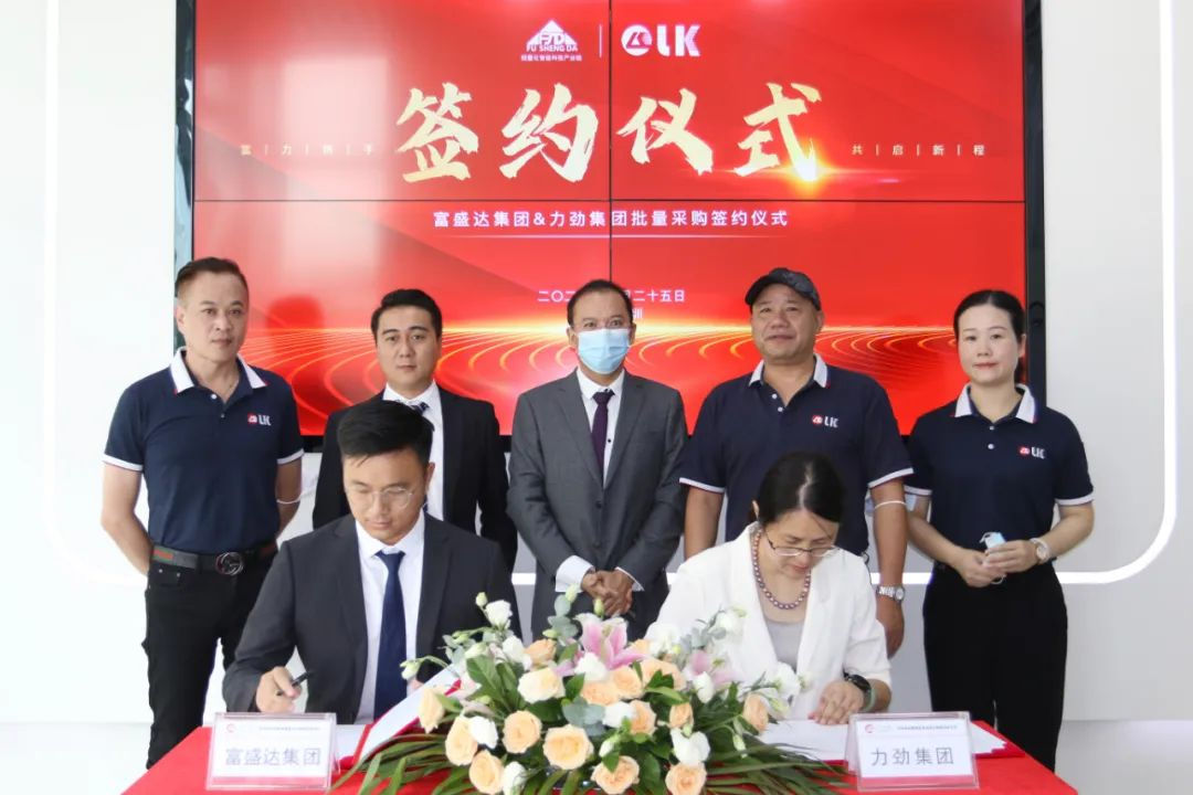 富盛達集團總經理肖威、力勁集團深圳領威科技有限公司總經理潘玲玲女士共同簽署力勁壓鑄單元批量采購協(xié)議。華南市場部總監(jiān)鄧毅明先生、副總監(jiān)練繼維先生等出席。