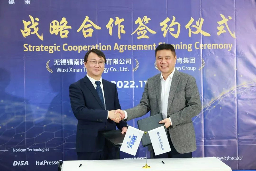 簽約儀式圓滿成功,出席嘉賓合影留念 近日,無錫錫南科技股份有限公司與諾瑞肯集團達成重要戰略合作,于11月24日在諾瑞肯漢江工廠舉行了隆重的戰略合作簽約儀式,使雙方的合作邁向了一個新的里程碑。 根據合作協議,諾瑞肯將利用自身優勢和資源,為錫南提供先進的技術和產品,如一體化壓鑄單元(具體壓鑄機噸位和數量因涉及商業機密暫不披露),熔煉爐,定量爐,拋丸機,除塵設備,數字化產品等。除了保持緊密的生產和技術交流,雙方也將在數字化轉型、SBTi科學碳目標設定及可持續發展等方面展開實質性深度合作,諾瑞肯將以自身在數字化領域的豐富實踐經驗,充分協助錫南推進減碳行動,提升綠色競爭力,共同推進鑄造行業的數字化轉型和可持續發展。 中國鑄造協會執行副會長高巍、諾瑞肯集團亞太區高級副總裁魏寶華、諾瑞肯集團鋁合金業務總裁Peter Holm Larsen、諾瑞肯集團鋁合金業務高級副總裁Marco Gandini,以及無錫錫南科技股份有限公司總經理李忠良、副總經理顧登峰等代表出席了本次的簽約儀式。 無錫錫南科技股份有限公司專業從事鋁合金輕量化汽車零部件的研發與生產,其主要產品為增壓器殼體,客戶涵蓋全球知名零部件制造商。隨著新能源汽車市場的快速發展,錫南近年來進一步加大投資,專注于新能源汽車驅動系統,傳動系統精密鋁合金殼體類零件研發與生產。由于生產過程對技術水平的要求極為嚴格,且在工藝方面對質量和設備穩定性的要求較高,錫南愈發堅定了與諾瑞肯加強合作的決心。