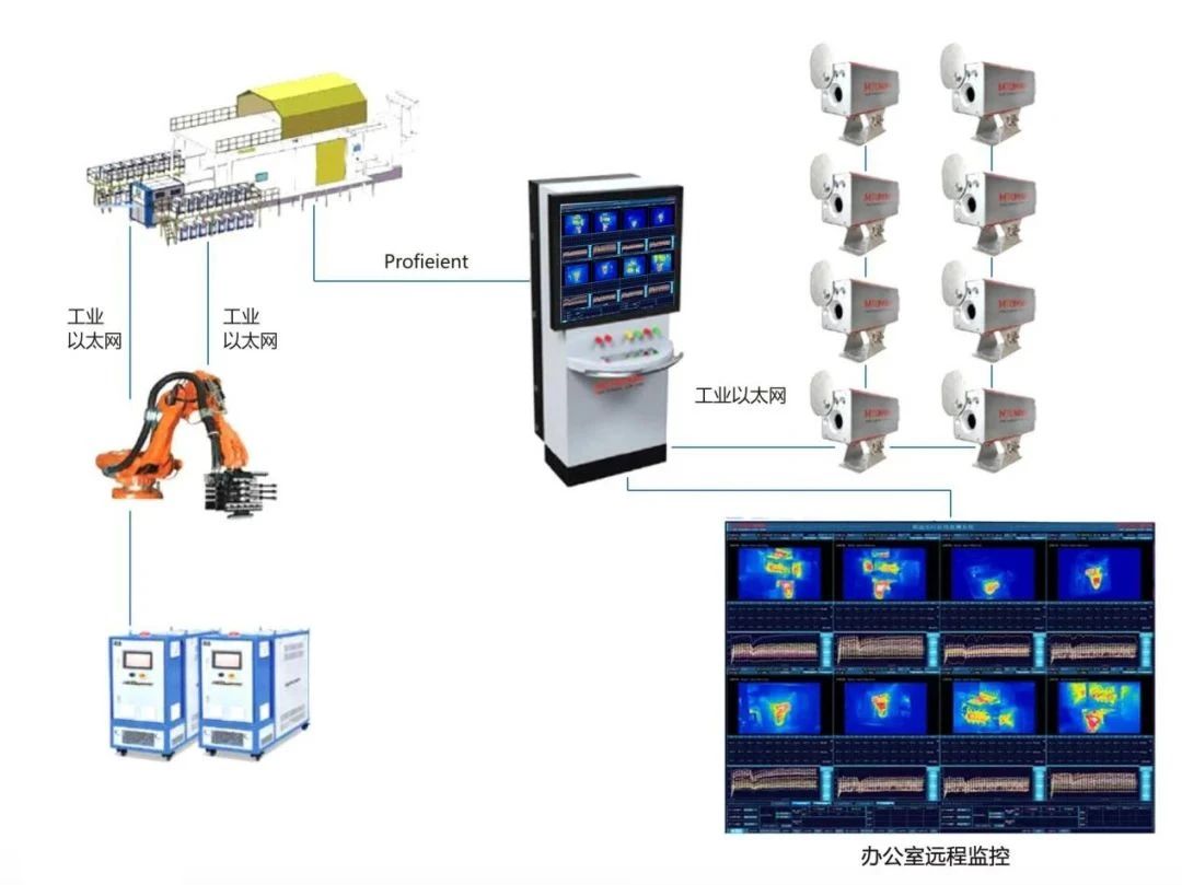 探譜特MTOM專研的紅外實(shí)時(shí)在線測(cè)溫系統(tǒng)便是模溫優(yōu)化的利器,能實(shí)時(shí)獲取模具溫度分布的熱像圖,并對(duì)溫度數(shù)據(jù)進(jìn)行記錄與分析。不僅能對(duì)比噴涂前后的模溫變化,也可展示同一模不同區(qū)域的模溫差異,以及每個(gè)位置不同模次的溫度變化趨勢(shì)。同時(shí),模溫實(shí)時(shí)在線監(jiān)測(cè)系統(tǒng)與壓鑄機(jī)控制系統(tǒng)對(duì)接,交換數(shù)據(jù)與控制信號(hào),實(shí)現(xiàn)自動(dòng)控制采集數(shù)據(jù),并且還可以與噴涂機(jī)器人、模溫機(jī)、點(diǎn)冷機(jī)等周邊設(shè)備通信并完成閉環(huán)控制。從而有效監(jiān)測(cè)壓鑄過(guò)程中的模具表面溫度與變化情況,為模溫優(yōu)化提供可靠依據(jù)。