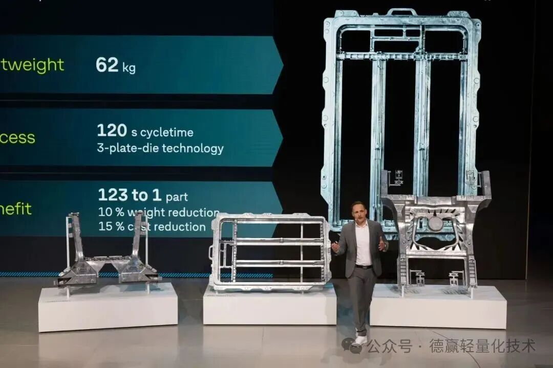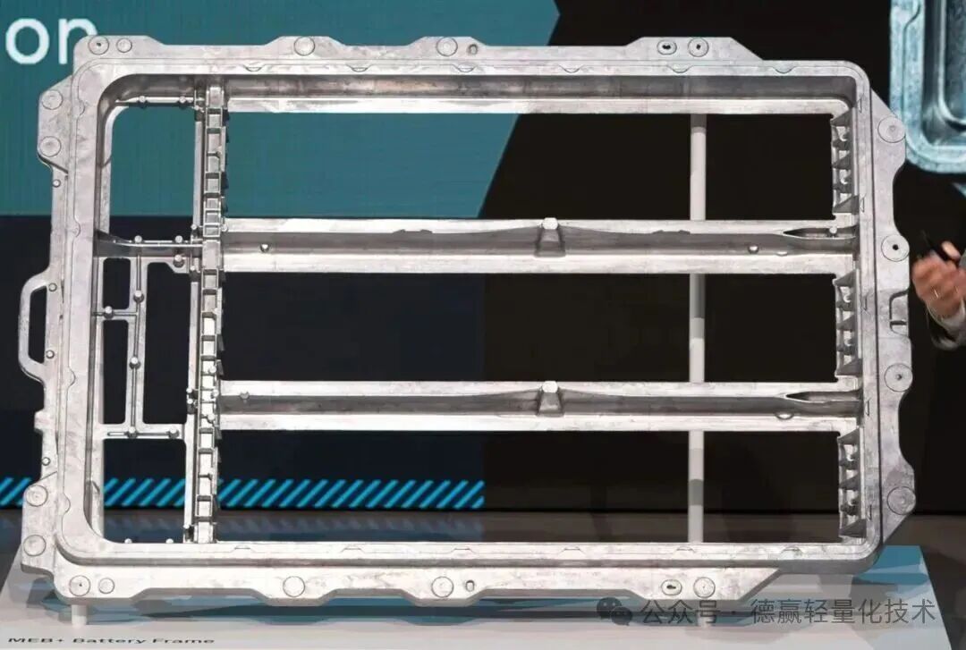 電池框架 此次展示的電池框架將成為大眾汽車旗下車型中首個應用一體化壓鑄技術(shù)的部件。其應用車型包括電動城市車系、ID. Polo、ID. Cross概念車、Cupra Raval以及斯柯達Epiq。 作為該德國集團迄今最復雜的鑄件,其長1.7米、寬1.15米,替代了123個獨立部件,助力整車減重10%至62公斤。 技術(shù)細節(jié)顯示其生產(chǎn)周期(節(jié)拍)時間為120秒,采用三板模具技術(shù),成本降低達15%。 該電池框架方案極具創(chuàng)新性,與以往我們見過的其他一體化壓鑄電池托盤存在顯著差異。