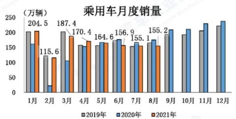 乘用車單月產銷同比降幅擴大 8月,乘用車產銷分別完成149.7萬輛和155.2萬輛,同比分別下降11.9%和11.7%。1-8月,乘用車產銷分別完成1289.1萬輛和1311.2萬輛,同比分別增長15.2%和16%。