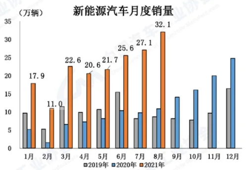 新能源汽車產銷繼續刷新記錄 8月,新能源汽車產銷分別完成30.9萬輛和32.1萬輛,同比均增長1.8倍。1-8月,新能源汽車產銷分別完成181.3萬輛和179.9萬輛,同比均增長1.9倍,累計銷量的滲透率接近11%。