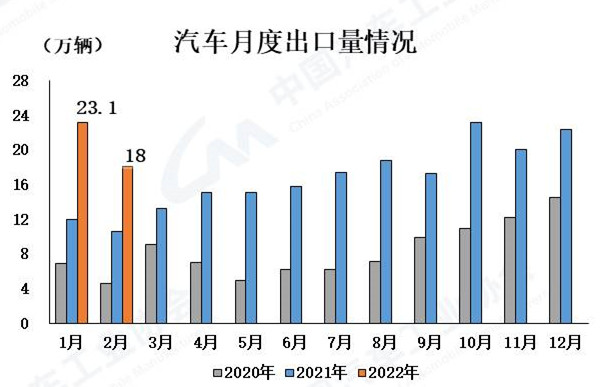 汽車出口同比繼續(xù)保持大幅增長(zhǎng) 2月,汽車企業(yè)出口18萬(wàn)輛,環(huán)比下降21.9%。同比增長(zhǎng)60.8%,繼續(xù)保持大幅增長(zhǎng)。1-2月,企業(yè)企業(yè)出口41.2萬(wàn)輛,同比增長(zhǎng)75%。