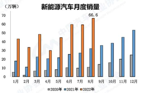 新能源汽車產銷繼續保持增長勢頭 8月,新能源汽車產銷分別完成69.1萬輛和66.6萬輛,月度產銷再創歷史新高,產銷同比分別增長1.2倍和1倍。1-8月,新能源汽車產銷分別完成397萬輛和386萬輛,同比分別增長1.2倍和1.1倍。