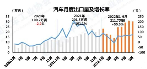 汽車出口呈強勢增長 9月,汽車企業(yè)出口30.1萬輛,環(huán)比下降2.6%,同比增長73.9%。1-9月,汽車企業(yè)出口211.7萬輛,同比增長55.5%。