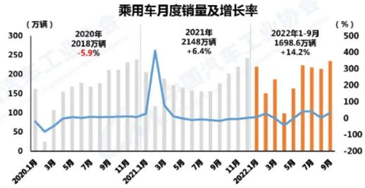 乘用車產(chǎn)銷呈企穩(wěn)增長態(tài)勢 9月,乘用車產(chǎn)銷分別完成240.9萬輛和233.2萬輛,環(huán)比分別增長11.7%和9.7%,同比分別增長35.8%和32.7%。1-9月,乘用車產(chǎn)銷分別完成1720.6萬輛和1698.6萬輛,同比分別增長17.2%和14.2%。