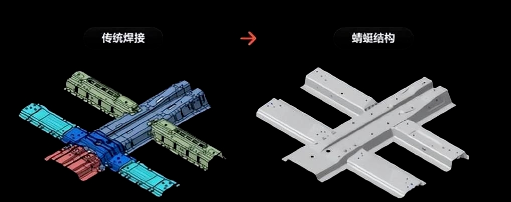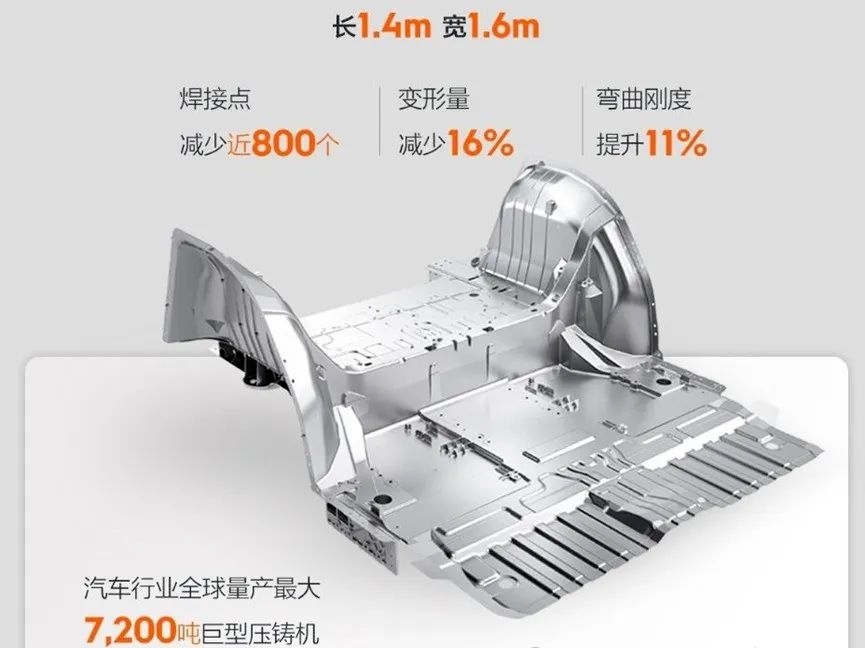 之后在2023年,發布了車身中段一體式壓鑄結構,將其中段一體式壓鑄結構稱為“蜻蜓結構”,使用7200T的壓鑄機,使得整體減少了16個部件、66個連接點,整車減重7%,座椅安裝點剛度平均提升18%,具有可變延伸設計。