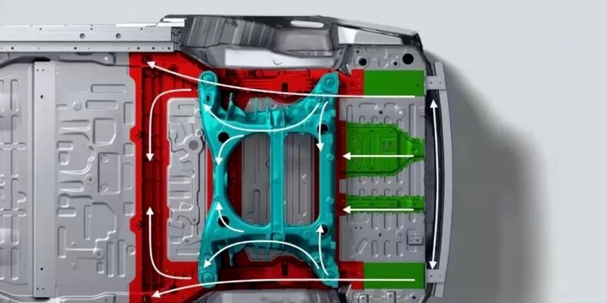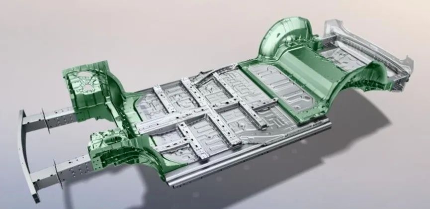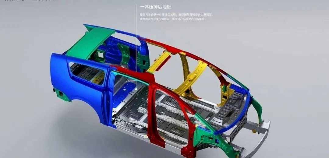 理想采用的是對后地板骨架進行了一體化壓鑄(即分體式的),因此它在集成(零部件減少,連接點減少)上是偏弱。