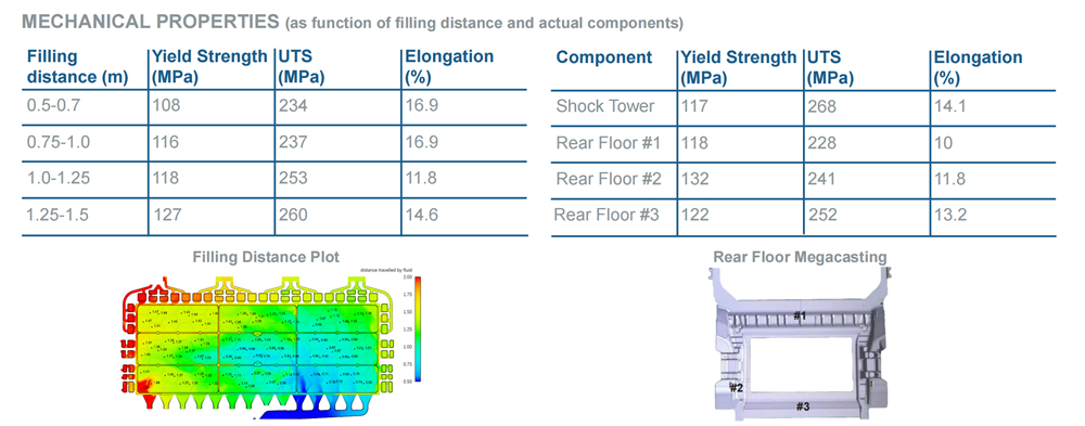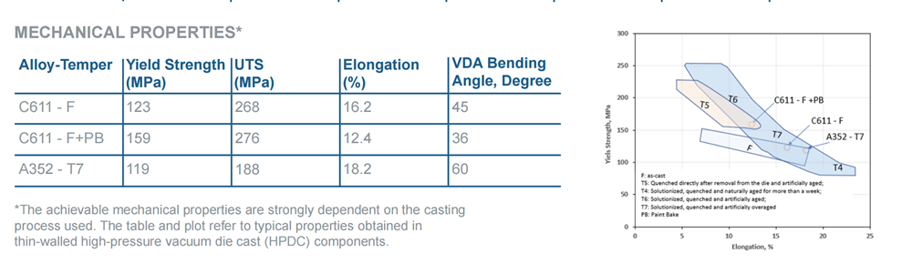 帥翼馳集團新材料事業部總經理 符文濤 作為國內低碳鋁合金開發生產的頭部企業,帥翼馳新材料集團有限公司于2016年開始研發和推廣適用于大型一體化壓鑄的免熱處理合金材料,2019年開始驗證應用免熱處理材料。目前,該公司牌號為C611的免熱處理材料已實現批量生產,被成功應用于國內頭部新能源汽車品牌的車身后地板及前倉等零部件上。 帥翼馳集團新材料事業部總經理符文濤先生表示:“免熱處理鋁合金材料是一體化壓鑄技術成功的關鍵,我們開發的C611是一款定制材料,其可達成的性能范圍較寬,可以根據客戶需求做定制開發,并能提供相應的性能數據,材料失效卡片,模流分析數據卡片,與材料相關鑄造工藝參數。因此,我們可以提供材料及其相關的工藝方案。” C611免熱處理材料性能參數如下: