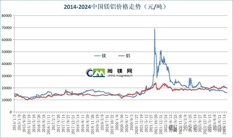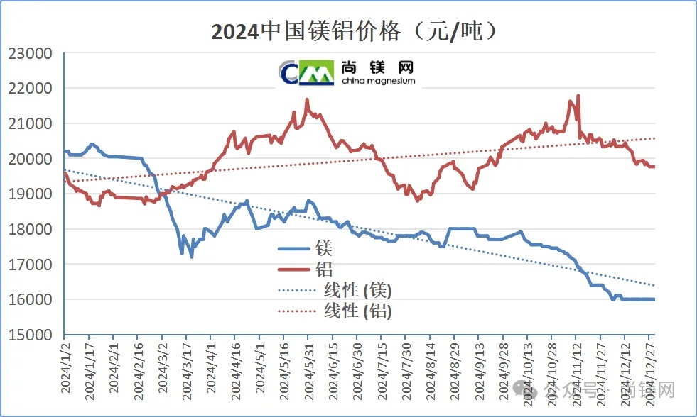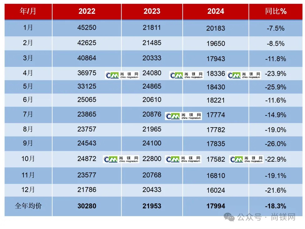 ![]() 2024年中國鎂錠價格一路下行,從年初的20200元/噸,下跌至年底的16000元/噸,16000元成為重要的價格支撐線。2024年底的鎂價格已經跌回到2021年4月水平,為44個月來最低值。2024年鎂價格月度平均值從1月份的20183元/噸,跌至12月份的16024元/噸。2024全年平均價格為17994元/噸,與2023年同比下降了18.0%,為4年最低值。年內價格凈跌去4200元,跌幅20.8%。 受鎂主產地榆林地區能耗雙控和環保整改影響,2021年9月中下旬開始的一輪鎂價格上漲周期大體上持續了8個月。隨著榆林地區鎂廠環保改造逐步完成,鎂生產和供求關系有了很大的改善,自2022年4月起,鎂價格進入下降通道,鎂生產企業再陷入經營困難時期。在成本因素支撐下,2022年下半年及2023年全年,鎂價格還能在20000-26000元之間波動,一直在20000元以上堅守。但是,進入2024年,由于鎂廠改造和生產的全面恢復,鎂供應量進一步增加,但是消費端并沒有同步跟進,鎂價在2月份就跌破20000元,其中二、三月和4季度跌幅最大。由于商業收儲行動和季節性采購因素,第二、三季度價格有所反彈并有所維穩,但是11月份之后價格再度急劇下行。全年鎂價凈跌去4200元,跌幅20.8%。 2024年年初價格:20200元(1月2日) 2024年年末價:16000元(12月30日) 最低價:16000元(12月30日) 最高價:20400元(1月19日) 年度平均價:17994元 2022-2024年中國鎂錠月度平均價(元/噸)