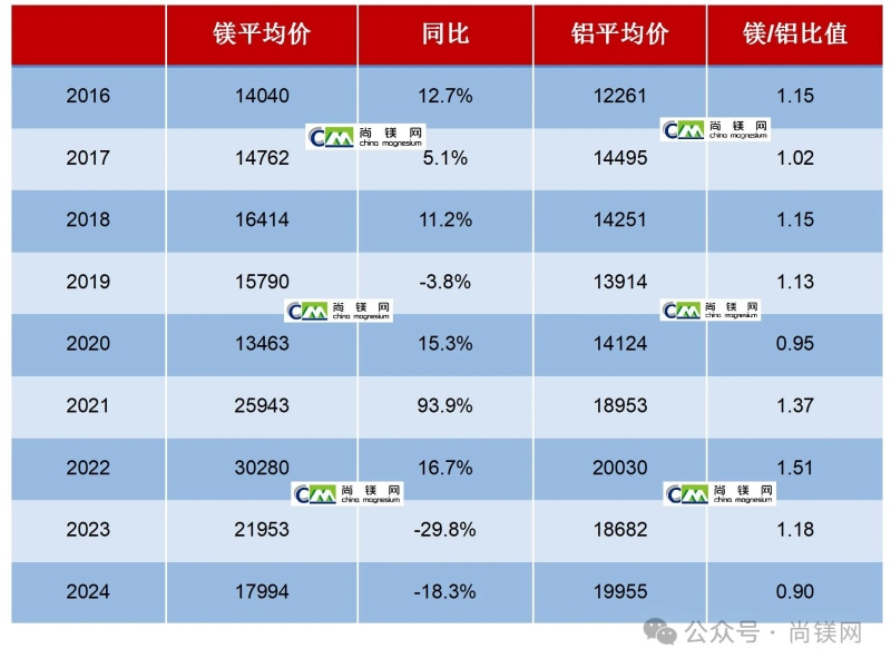 2016-2024年中國鎂錠與鋁錠年度平均價及鋁鎂比值(元/噸)