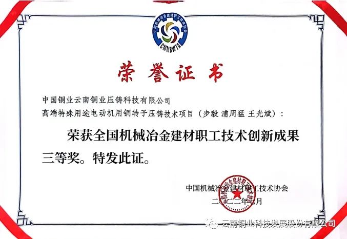 江蘇嶸泰股份副總經(jīng)理張偉中介紹,“今年以來,新能源訂單大幅增長,同比增加50%以上,目前公司一期產(chǎn)能已經(jīng)飽和,二期項目的快速推進(jìn),將解決我們產(chǎn)能不足的壓力,預(yù)計在二季度進(jìn)行試生產(chǎn),下半年進(jìn)入批量生產(chǎn),今年二期項目有望實現(xiàn)產(chǎn)值2個億。”該項目分兩期建設(shè),項目全部建成達(dá)產(chǎn)后,可形成年產(chǎn)新能源汽車鋁合金精密壓鑄件410萬件。 云銅科技“高端特殊用途電動機(jī)用銅轉(zhuǎn)子壓鑄技術(shù)項目”榮獲創(chuàng)新成果獎 來自云南銅業(yè)科技發(fā)展股份有限公司消息,近日,其“高端特殊用途電動機(jī)用銅轉(zhuǎn)子壓鑄技術(shù)項目”榮獲2022年度全國機(jī)械冶金建材行業(yè)創(chuàng)新成果三等獎。