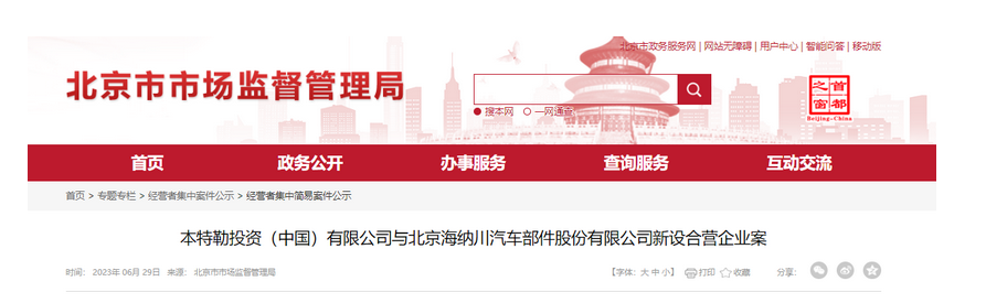 日前(6月29日),北京市市場監(jiān)管局網(wǎng)站發(fā)布消息,本特勒投資(中國)有限公司(“本特勒”)與北京海納川汽車部件股份有限公司(“海納川”)簽署協(xié)議擬于中國北京市共同出資設(shè)立兩家合資經(jīng)營企業(yè)。兩家合營企業(yè)擬主要從事乘用車底盤模塊業(yè)務(wù)。