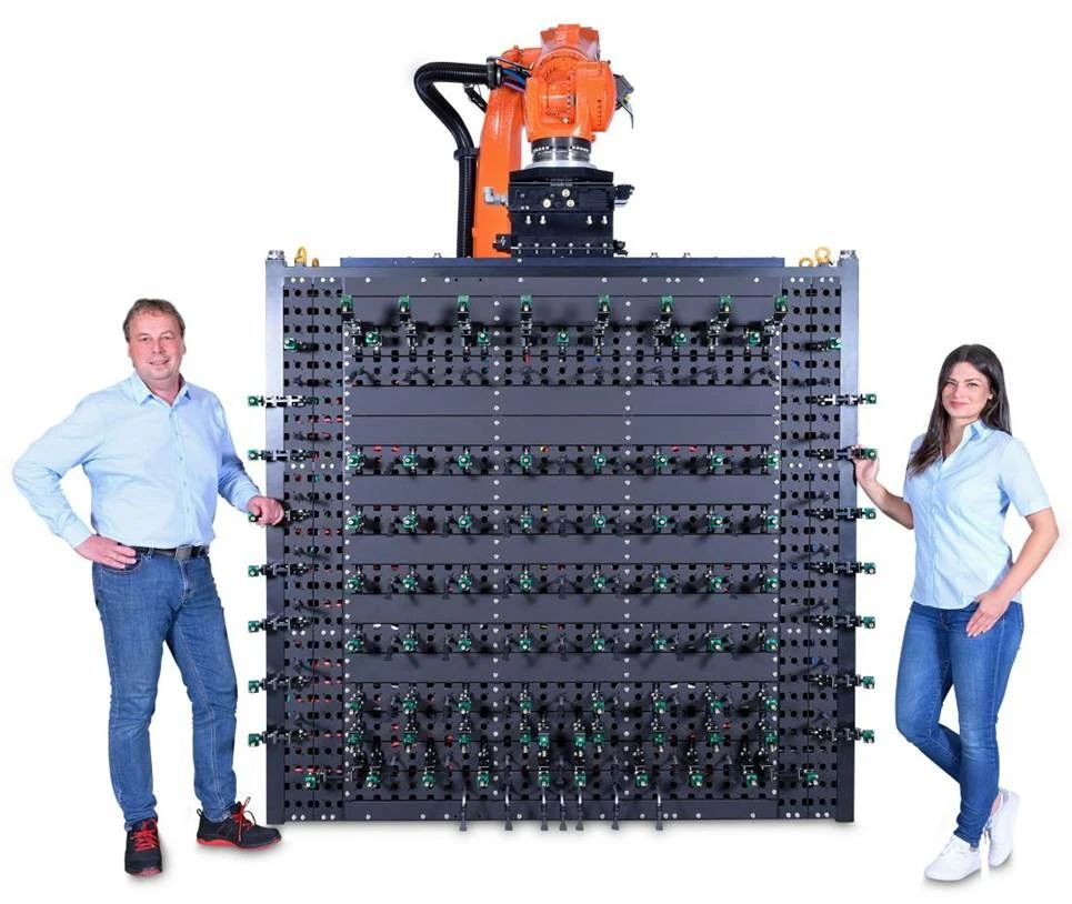 博馬為16000T超大型壓鑄單元開(kāi)發(fā)的噴涂系統(tǒng)包含了一體式配比站,動(dòng)定模維護(hù)柜,噴涂機(jī)器人管線包和大型一體壓鑄噴涂工裝等設(shè)備。其中配比站為雙功能模式,可提供原液,以及稀釋比例1:999的脫模劑供應(yīng),脫模劑輸出壓力在0.5bar-16bar無(wú)極調(diào)節(jié),并支持高低濃度脫模劑任意切換。此噴涂工裝是有史以來(lái)最大的一體式工裝,總尺寸達(dá)1800mmx1800mm,全鋁結(jié)構(gòu),結(jié)構(gòu)強(qiáng)度高相比于常規(guī)工裝,重量減輕50%以上,其中噴嘴采用外混式微量噴嘴,整體仿型設(shè)計(jì)。