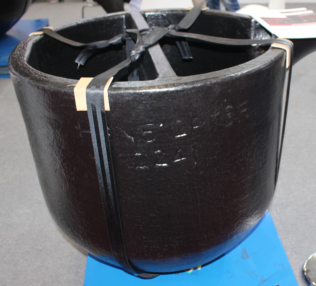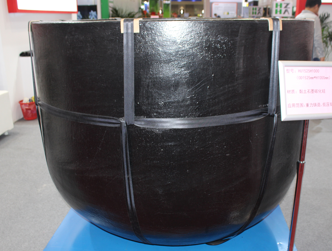 此次展出的HU1525H1000 黏土石墨碳化硅坩堝,高度1000mm,容量2.8噸。該款產品最高高度可做到1480mm,可熔煉4.5噸有色金屬。作為大容量坩堝,技術工藝要求更高,公司技術團隊經過多年的技術攻關,研發出了該款產品,主要應用于汽車上的關鍵零部件生產,使用壽命長,可滿足生產該系列部件所需要的極高純度的鋁液的要求。