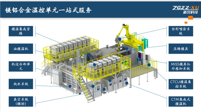 鎂鋁合金溫控單元一站式服務解決方案 寧波新昱智能科技有限公司始終專注于鎂鋁合金壓鑄車身熱管理系統(tǒng)領(lǐng)域。公司所有溫控設(shè)備均為自主研發(fā),亦是國內(nèi)市場上溫控設(shè)備產(chǎn)品線最齊全的企業(yè)之一。憑借對壓鑄行業(yè)的深耕,公司將整套溫控系統(tǒng)與模具設(shè)計、壓鑄工藝、仿形噴涂及真空輔助技術(shù)深度融合,打造大型智能化溫控單元一站式服務,致力于解決壓鑄汽車零部件在生產(chǎn)中面臨的良品率低、效率低、節(jié)拍慢、成本高等問題。