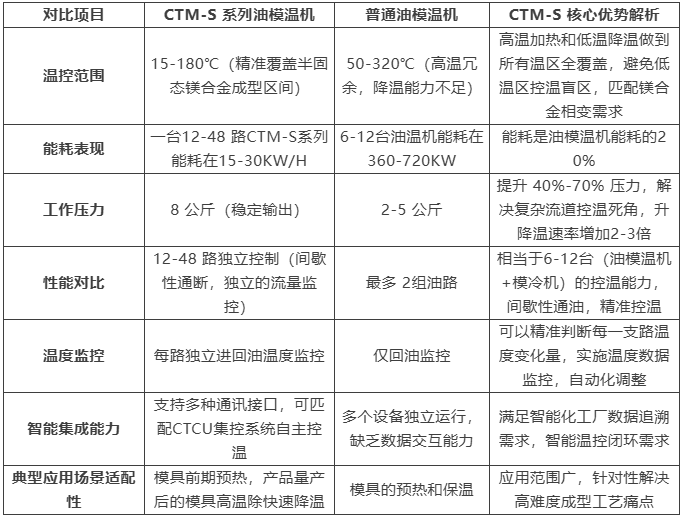 半固態(tài)專用溫控CTM-S系列油模溫機 為此,新昱科技全新推出半固態(tài)專用溫控新裝備CTM-S系列油模溫機,對比傳統(tǒng)油模溫機有如下特點: