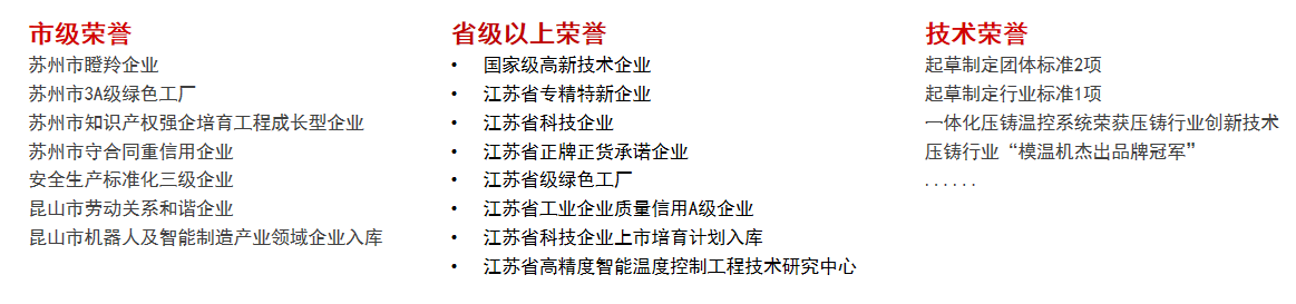 ● 行業(yè)口碑認(rèn)可:連續(xù)兩年斬獲壓鑄行業(yè) “模溫機(jī)杰出品牌冠軍”,2019 年成功通過知識產(chǎn)權(quán)貫標(biāo)認(rèn)證,獲評蘇州市瞪羚企業(yè),并入選昆山市機(jī)器人及智能制造產(chǎn)業(yè)領(lǐng)域企業(yè)庫。一系列榮譽(yù)不僅是對公司實(shí)力的肯定,更奠定了其在工業(yè)溫控領(lǐng)域的領(lǐng)先品牌地位。
