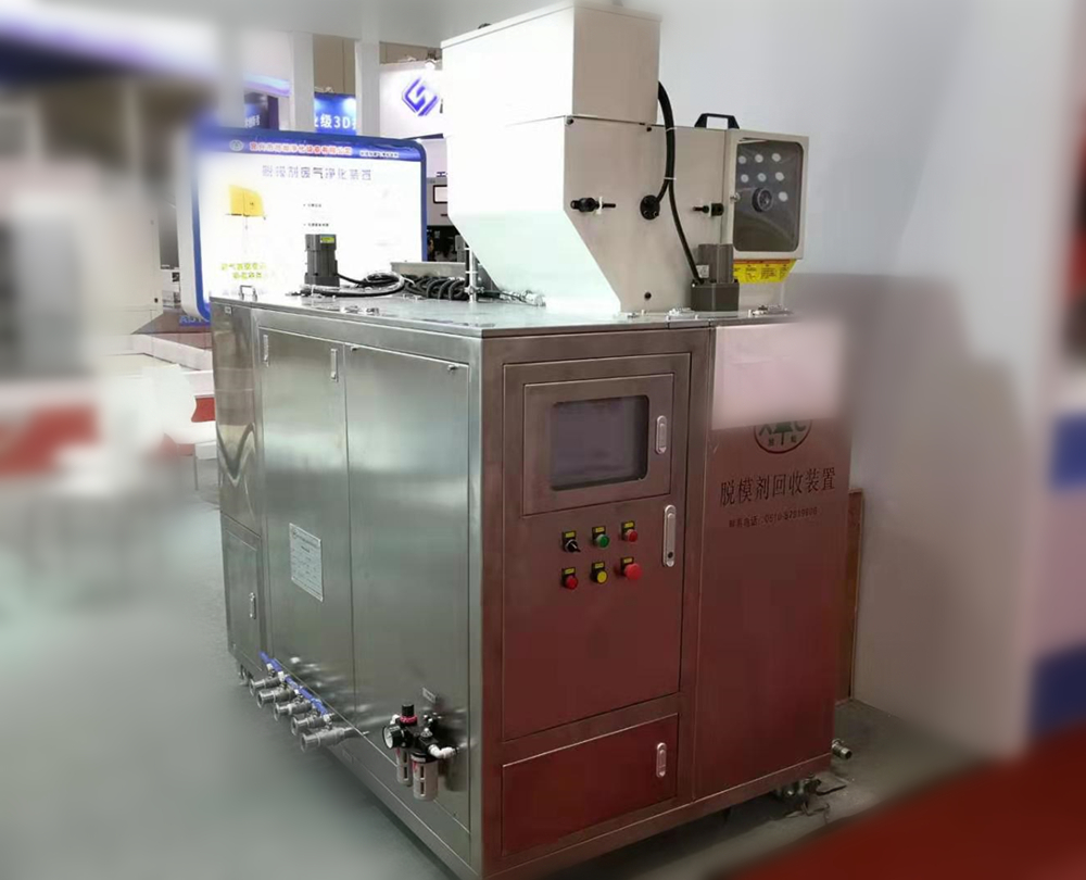 宜興旭燦脫模劑回收裝置 脫模劑回收裝置主要部件采用進口件,故障率低,使用壽命長;箱體采用不銹鋼(304)材料,不僅美觀,還減少腐蝕;使用和維修簡單,不需要專業人員;實時濃度檢測,動態自動配比,全自動運行系統,安全可靠。 脫模劑廢氣凈化裝置為宜興旭燦今年新開發的產品。這是一種安裝在壓鑄機開模框上部、同時包蓋噴霧機的一種凈化裝置。在靜電油霧處理器風機帶動下,強大吸力將脫模劑噴涂時產生的廢氣收集到煙罩里,而后煙霧從吸入口進入并通過管道經前置過濾網過濾,再穿過靜電吸附區高效過濾,再次經后置過濾網排出潔凈的空氣。