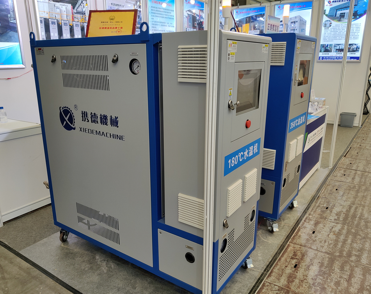 攜德機械總經理周鋒先生為專業觀眾介紹產品 據介紹,攜德180℃水溫機以水作為傳熱介質,通過密封加壓,使水的沸點最高提至180℃。而水的使用成本低,且不對生產環境造成污染,并且水的導熱性能好。當冷機冷模需要預熱生產時,相比油溫機,水溫機能更快將模具升至工藝要求的溫度,并精準控制在±1℃以內。