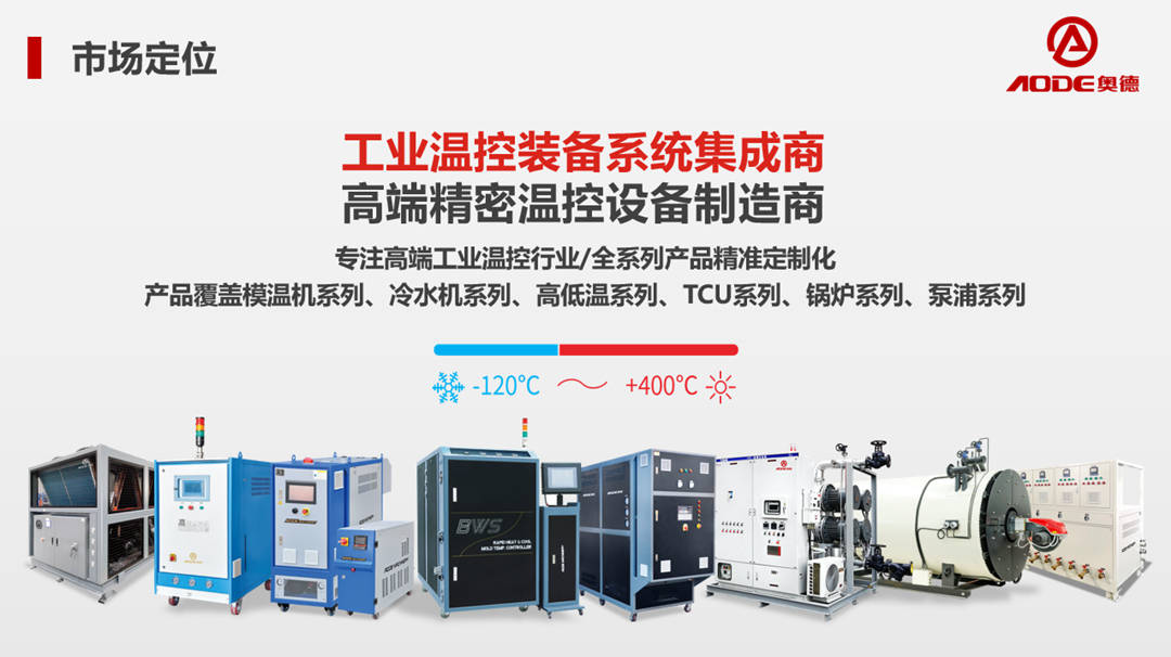 據介紹,作為“工業溫控裝備系統集成商”,奧德高端裝備公司為工業品成型制造提供系統集成的成套溫控解決方案。目前,奧德研發與制造全系列溫控設備,擁有完整的溫控產品線,產品涵括模溫機、冷水機、TCU溫控單元、高低溫冷熱一體機、點冷機、模冷機、蒸汽/導熱油鍋爐、高低溫流體輸送泵等,溫度控制范圍從低溫-120℃至高溫400℃,系行業內工業溫控產品最全的企業之一。 “精密冷熱溫控設備制造商”,則是奧德從產品和品質角度自我定位。奧德正在打造強大的“供應鏈中心”,不斷完善技術研發體系、質量管理體系,引進國際領先管理及經驗并結合奧德企業實際,與國際先進制造企業接軌,開發技術領先、品質優良、精密高效、穩定可靠的工業溫控設備。 對企業和產品,奧德高層對自身提出新的要求和目標,那就是“創新、差異化、對標國際”的發展道路。全方位創新、全面差異化策略,無論是產品、技術、服務,還是管理模式、營銷策略……,都走一條創新、差異化的路線,并學習國際先進技術及管理經驗,對標國際一流企業。