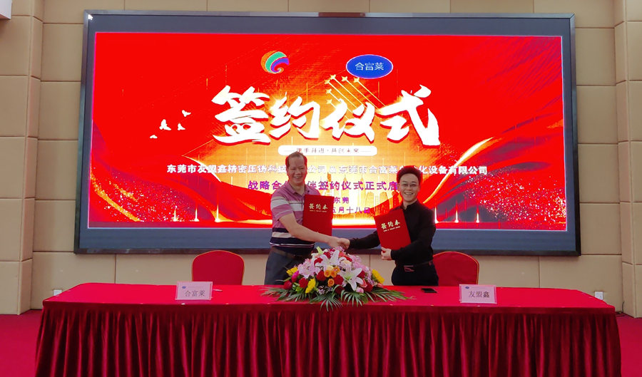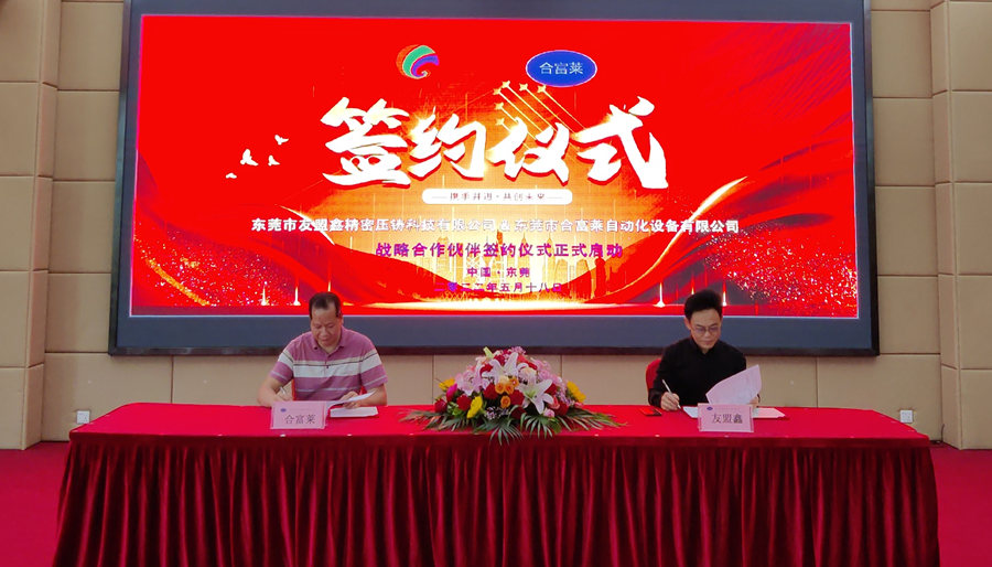 ![]() 雙方企業(yè)主要領(lǐng)導(dǎo)與嘉賓合影 《壓鑄周刊》現(xiàn)場報(bào)道:2022年5月18日上午,廣東東莞,東莞友盟鑫精密壓鑄科技有限公司(“友盟鑫科技”)與東莞市合富萊自動化設(shè)備有限公司(“合富萊自動化”)聯(lián)合舉行“批量采購壓鑄自動化設(shè)備暨戰(zhàn)略合作簽約儀式”。友盟鑫科技董事長黃忠友先生、合富萊自動化總經(jīng)理?xiàng)畋s先生分別代表各自企業(yè)在采購協(xié)議上簽字。