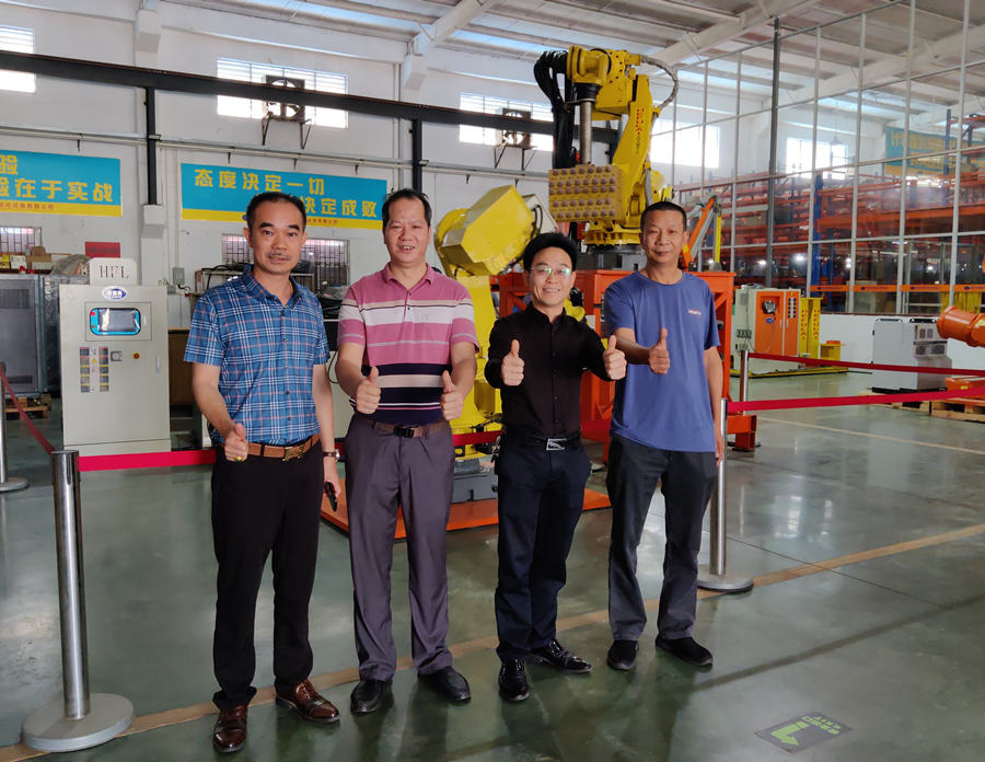 友盟鑫科技黃忠友董事長一行參觀合富萊自動化生產(chǎn)車間 友盟鑫科技董事長黃忠友先生表示:“很高興今天在這里和合富萊公司達(dá)成戰(zhàn)略合作協(xié)議,經(jīng)過一段時(shí)間的深入交流和了解,合富萊公司向我們展示了在技術(shù)、質(zhì)量、服務(wù)方面的綜合實(shí)力及優(yōu)勢。友盟鑫是一家專注于鎂合金、鋁合金壓鑄零部件研發(fā)制造的企業(yè),在國內(nèi)率先把鋁鎂合金材料從航天領(lǐng)域引用到LED顯示屏箱體制造領(lǐng)域;和常規(guī)壓鑄箱體相比較,鋁鎂合金箱體除了具備壓鑄鋁箱體的傳統(tǒng)優(yōu)點(diǎn)外,同時(shí)又具備更輕散熱更佳、屏蔽性更優(yōu)、強(qiáng)度更好等優(yōu)點(diǎn)。目前,友盟鑫公司掌握了多項(xiàng)鎂合金箱體制造的核心技術(shù),申請了20余國家專利;其中鋁鎂合金變形精度控制技術(shù)、鋁鎂合金防氧化技術(shù),填補(bǔ)國內(nèi)領(lǐng)域的技術(shù)空白。” 黃忠友先生接著說:“此次采購的設(shè)備將投放于我們的重慶生產(chǎn)基地。在過去十多年我們深耕華南市場,主要為LED、消費(fèi)電子等行業(yè)用戶提供壓鑄件產(chǎn)品。去年我們謀劃實(shí)施新的企業(yè)發(fā)展、業(yè)務(wù)多元化的戰(zhàn)略,在重慶銅梁購買了50畝工業(yè)用地,拓展西南市場,并計(jì)劃將產(chǎn)品線延伸至汽車零部件、通訊、軍工等領(lǐng)域。這次和合富萊公司的簽約是雙方合作的開始,期待未來彼此有更多更深入的合作。” 合富萊自動化董事長楊炳榮先生表示:“很榮幸獲得行業(yè)知名鎂合金壓鑄燈箱制造商—友盟鑫科技公司的認(rèn)可并且雙方達(dá)成戰(zhàn)略合作伙伴,接下來我們必將上下一心,按時(shí)并保質(zhì)保量交付該批次壓鑄自動化設(shè)備。合富萊公司專業(yè)從事壓鑄給湯機(jī)、噴霧機(jī)、取件機(jī)等‘壓鑄三手’及壓鑄島機(jī)器人自動化的研發(fā)與制造,在壓鑄自動化領(lǐng)域擁有16年技術(shù)與經(jīng)驗(yàn)的沉淀,壓鑄自動化產(chǎn)品以‘穩(wěn)定、高效、耐用’著稱,在行業(yè)擁有良好的口碑和知名度。期待通過本次合作,雙方之間能攜手進(jìn)步,共創(chuàng)雙贏。”
