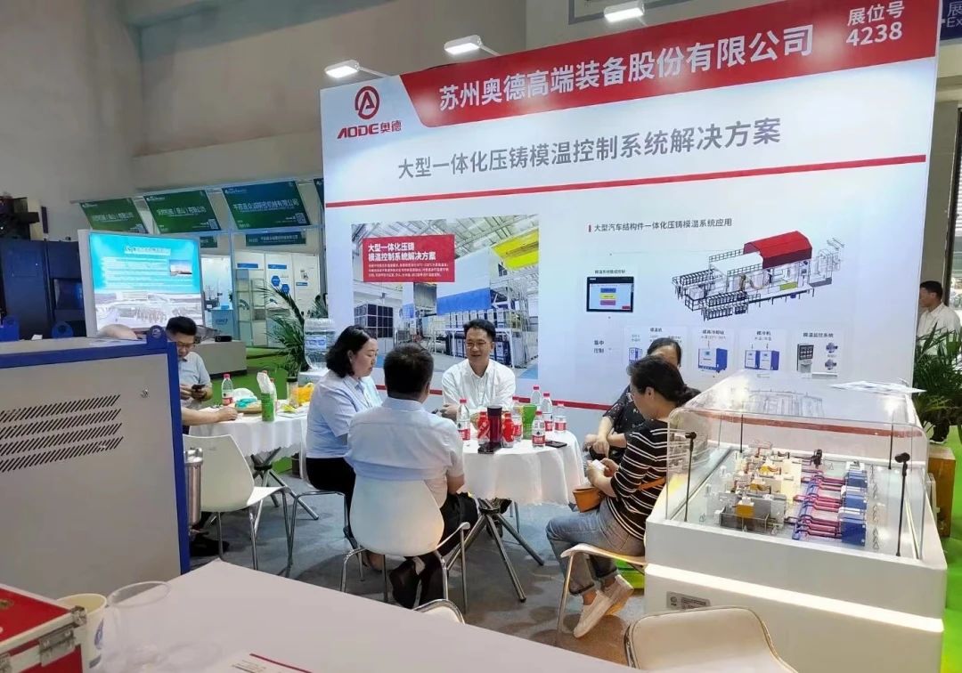 深圳奧德總經(jīng)理黃文欽先生(中)與客人交流 奧德點冷機,具有高壓噴射冷卻,單點/路可控,斷芯報警,高效冷卻/單機循環(huán),內(nèi)管管徑≤φ2.5點冷管的冷卻等功能。用于控制凝固+縮孔,有效冷卻,控制冷卻時間,減少噴涂時間,減少產(chǎn)品縮孔,防止型芯銷燒損,提高生產(chǎn)效率。此外,奧德還向西南地區(qū)客戶展示其在大型一體化壓鑄島溫控方面的技術(shù)成果和豐富經(jīng)驗。 |