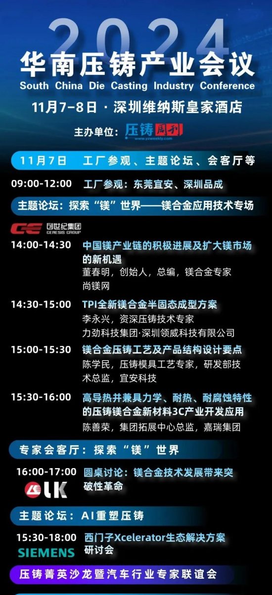 不僅如此,創(chuàng)世紀集團為“處在風(fēng)口”的新能源汽車一體化壓鑄件的深加工,推出了一系列高效的加工解決方案。在服務(wù)上,創(chuàng)世紀集團提供全方位的售后服務(wù)和技術(shù)支持,如1812服務(wù)標準和VIP駐廠服務(wù)等,確保客戶在使用過程中遇到的問題能夠得到及時解決。 2024華南壓鑄產(chǎn)業(yè)會議將于11月7日-8日在深圳維納斯皇家酒店隆重舉行。作為行業(yè)內(nèi)的領(lǐng)軍企業(yè),創(chuàng)世紀集團將派出技術(shù)專家在會議上作報告,分享新能源汽車零部件壓鑄后的CNC加工應(yīng)用解決方案,并展示最新的五軸龍門加工中心和臥式加工中心。 會上,創(chuàng)世紀集團的技術(shù)專家將聚焦于“新能源汽車壓鑄零件的加工技術(shù)”這一核心議題,著重介紹如何通過智能化技術(shù)提升加工精度和效率,這些設(shè)備能夠滿足新能源汽車零部件加工的高精度和高效率要求。此外,還將介紹一系列智能化整體解決方案,為客戶提供全鏈條智能化支持。通過這些創(chuàng)新產(chǎn)品和技術(shù),創(chuàng)世紀集團希望幫助新能源汽車行業(yè)實現(xiàn)更高效、更智能的生產(chǎn)方式。 2024華南壓鑄產(chǎn)業(yè)會議,將于2024年11月7日-8日在深圳維納斯皇家酒店隆重舉行。大會由行業(yè)知名媒體《壓鑄周刊》主辦,旨在引進全國優(yōu)質(zhì)資源,打造華南壓鑄界最專業(yè)的會議平臺。 為提升大會品質(zhì)和會議報告質(zhì)量,主辦單位已邀請全國優(yōu)秀專家做主題報告。與此同時,2024華南壓鑄產(chǎn)業(yè)會議還引進中國機械工程學(xué)會鑄造分會(FICMES)主辦的“2024壓鑄行業(yè)專家會議”、“汽車鑄造俱樂部活動-華南站” ,西門子“AI重塑壓鑄- Xcelerator生態(tài)解決方案路演”作為同期活動,相得益彰,交相輝映。 大會日程