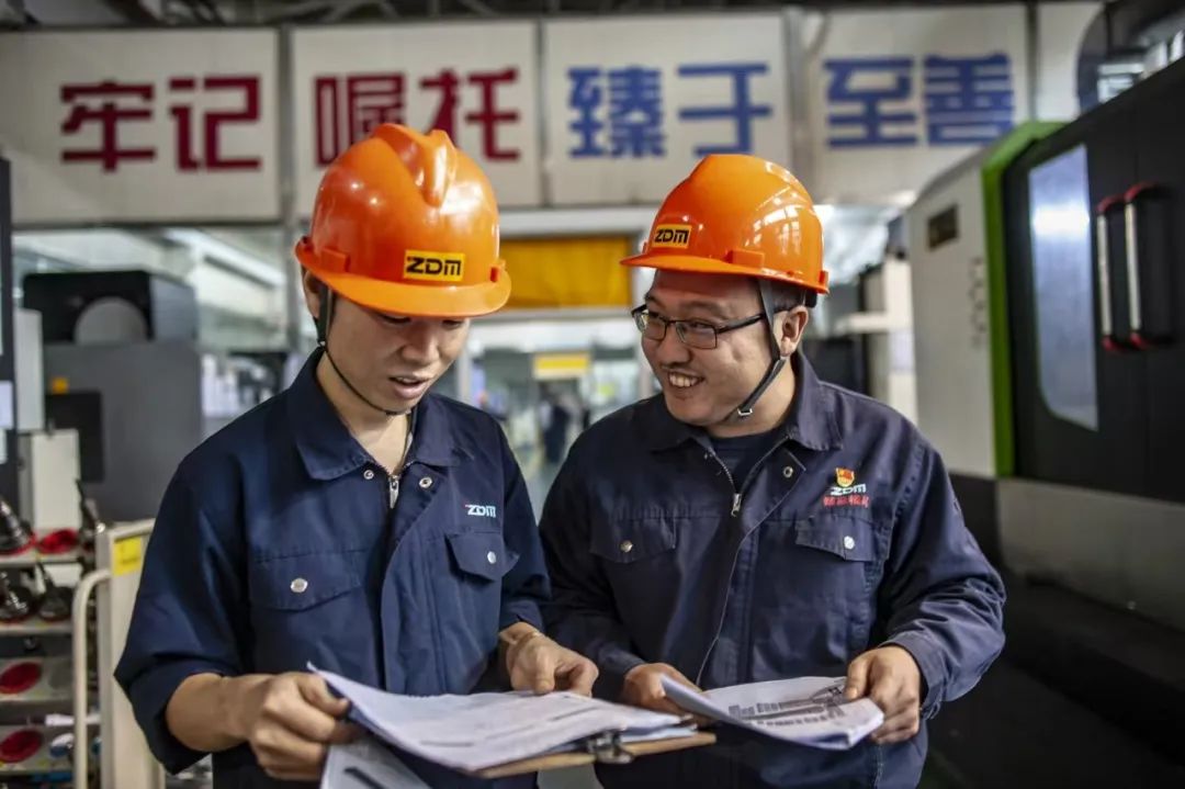 企業(yè)生產(chǎn)車間內(nèi)員工交流經(jīng)驗(yàn) 對此,技術(shù)團(tuán)隊(duì)經(jīng)常奮戰(zhàn)在機(jī)器旁,積極探索、不斷嘗試,致力于突破某項(xiàng)技術(shù)難點(diǎn),優(yōu)化某臺生產(chǎn)設(shè)備。 “有了這種模具噸位制造的實(shí)力,就意味著企業(yè)贏得了更大市場。”劉瑾介紹,“但我們追求的終極目標(biāo),并不是噸位的升級,而是在能力范圍內(nèi)把所有的產(chǎn)品做精做好。” 今年11月,臻至還交付了一臺13500噸的適配壓機(jī),模具自重102噸,制作周期128天,生產(chǎn)效率獲得了合作客戶的高度認(rèn)可。