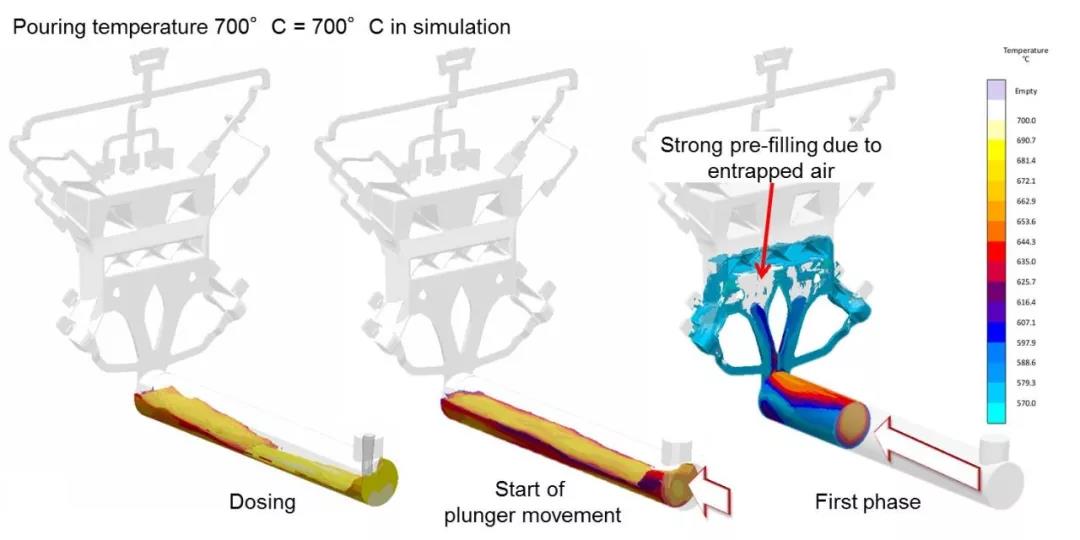 ![]() 圖4:考慮壓射室的接頭模具充型分析。在沖頭運(yùn)動的第一階段,所選擇的壓射曲線導(dǎo)致大量的卷氣和金屬液的顯著溫度損失。