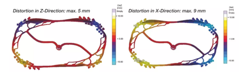 初始設(shè)計(jì)的變形分析(放大20倍;左:垂直,右:水平) 高壓壓鑄工藝本身的布局要求尤為苛刻。早期就必須得出針對設(shè)計(jì)和鑄件參數(shù)可能組合的可比較和可靠的結(jié)果。DGS的項(xiàng)目管理領(lǐng)導(dǎo)者 Axel Schmidt記得那些最關(guān)鍵的問題:“該鑄件數(shù)米長的流動(dòng)長度能夠被完全填充嗎?完全填充需要多長填充時(shí)間?如果充型金屬流前端在金屬流動(dòng)2到3米后再匯聚會(huì)發(fā)生什么?我們必須在早期就回答這些問題,以研究出節(jié)約成本和有效利用資源的方法,引導(dǎo)項(xiàng)目獲得成功”。開始階段,開發(fā)出采用兩個(gè)澆口區(qū)域的設(shè)計(jì)方案,并采用MAGMASOFT®進(jìn)行了評估,考察了諸如“流動(dòng)長度”、“充型溫度”和“材料追蹤”等不同的質(zhì)量標(biāo)準(zhǔn)。正如結(jié)果所示,解決框架變形問題是最具挑戰(zhàn)性的任務(wù)。 第一次模擬結(jié)果表明,在采用初始澆口設(shè)計(jì)方案的情況下,框架縱向變形最大9毫米,橫向變形最大為5毫米 ——該結(jié)果遠(yuǎn)遠(yuǎn)滿足不了客戶的要求。形勢非常嚴(yán)峻, DGS團(tuán)隊(duì)的唯一選擇只能是重新設(shè)計(jì)澆注系統(tǒng)。專家再一次采用 MAGMASOFT®進(jìn)一步核查了基于經(jīng)驗(yàn)的選項(xiàng)。按照DGS的經(jīng)驗(yàn),MAGMASOFT®是他們項(xiàng)目滿足交貨時(shí)間,同時(shí)確保生產(chǎn)工藝成功的關(guān)鍵因素。 最終他們成功找到了解決方案:即設(shè)計(jì)出在四個(gè)角設(shè)置內(nèi)澆口(內(nèi)澆口數(shù)量合計(jì)為20個(gè))的一套澆注系統(tǒng)。Axel Schmidt 簡要概括道:“要設(shè)計(jì)出框架變形最小的設(shè)計(jì)方案,MAGMASOFT®發(fā)揮了關(guān)鍵作用。快速并及早測出不同的變化是非常有必要的,這使得我們能夠采用合適方法設(shè)計(jì)澆注系統(tǒng),使其對鑄件施加的應(yīng)力盡可能降低到最小。采用該方法,我們可以完全避免任何重大變形,同時(shí)盡量減少其它鑄造缺陷。‘材料追蹤’結(jié)果使得我們可以檢查金屬流的均衡流動(dòng)。當(dāng)然,‘變形’結(jié)果被用于極為詳細(xì)地分析零件的變形,并記錄和討論每個(gè)設(shè)計(jì)修改的效果。” 接下來,修正后的鑄造工藝方案將應(yīng)用到實(shí)際生產(chǎn)中。鑲件和冷卻管路的設(shè)計(jì)和布局是未定的重大任務(wù)。DGS團(tuán)隊(duì)再一次采用MAGMASOFT® 制定出10倍分隔后的壓鑄模半模的冷卻方案。兩個(gè)半模重量為14.1噸和20.3噸,最終確定鑄件的特殊尺寸和冷卻要求。最后,模型設(shè)計(jì)完成,并及時(shí)投入鑄造和生產(chǎn)。如今,他們的產(chǎn)品是兩個(gè)主要太陽能集能器制造商必不可少的部分。