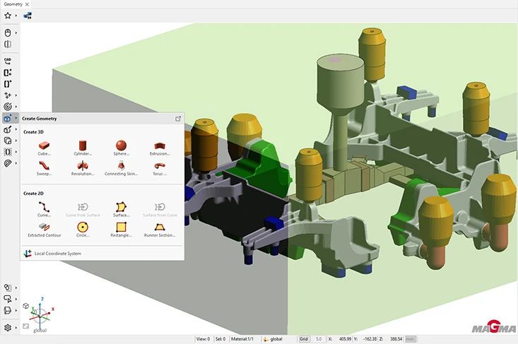 幾何界面的新功能方便用戶進行幾何體的編輯,新的三維坐標系統使用戶能夠更加直觀的旋轉和定位幾何體。在MAGMASOFT®6.0中,用戶可以在幾何界面中保存顯示設置,并在幾何界面和其他界面使用保存的顯示設置。例如,在幾何界面中預先保存重要的視圖,并在以后使用它們對結果進行(自動)評估。這有助于在項目開始時就能更快、更有效地進行鑄造和工藝開發。