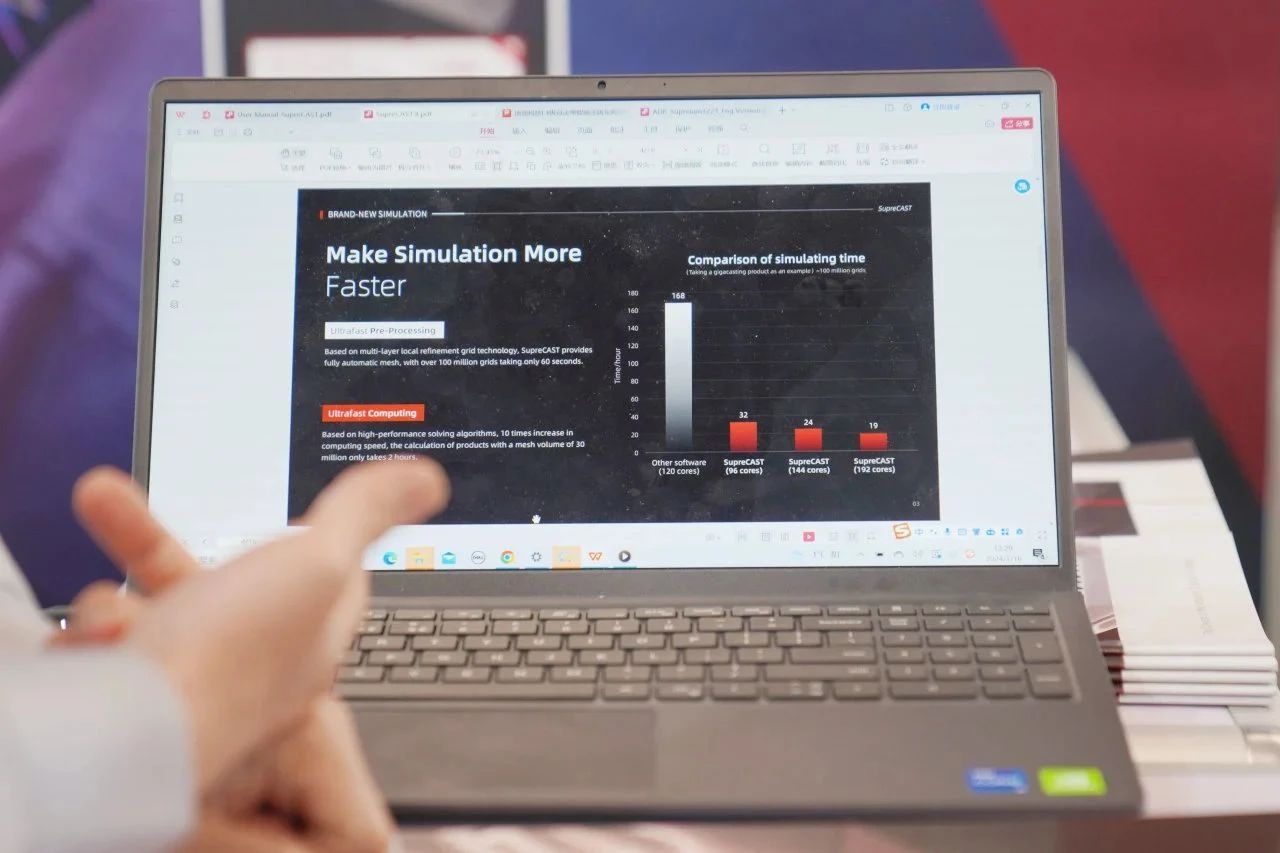 適創展位客戶交流精彩片段 云計算模式是優勢,但算法求解器則是SupreCAST強勢入局,且獨樹一幟的核心武器。 前后處理:SupreCAST采用多層局部加密網格技術,實現了網格剖分環節的自動化、智能化,億級網格的剖分僅需耗時60秒左右;同時,基于數據極限解壓縮技術,SupreCAST可在幾秒內完成超大模型的加載和渲染,帶給用戶超出預期的云原生仿真體驗。 流動求解:SupreCAST采用LBM算法和大渦模擬,可精準計算復雜形狀鑄件的紊流填充過程,準確模擬鑄造過程型腔內濺射流形態,高度還原真實流態,最大程度地保證了模擬的準確性。 溫度求解:SupreCAST采用了4D界面換熱系數模型,并根據合金凝固狀態和模具表面溫度自動調整,從而更加準確地找到找到模具溫度的變化規律,預測凝固時間。 因此,雖然現場時間有限,但許多客戶已經自發注冊SupreCAST,開始體驗云原生仿真的輕快與高效;同時,適創科技合伙人兼銷售總監黃志鵬先生也在現場與BMW、GF、Tesla、意迪特、MAGNA等企業技術負責人和高級管理人員進行了深入溝通,圍繞云仿真、項目合作開發、智慧工廠等整體解決方案等話題交流了更多合作發展的意向。 現場精彩瞬間